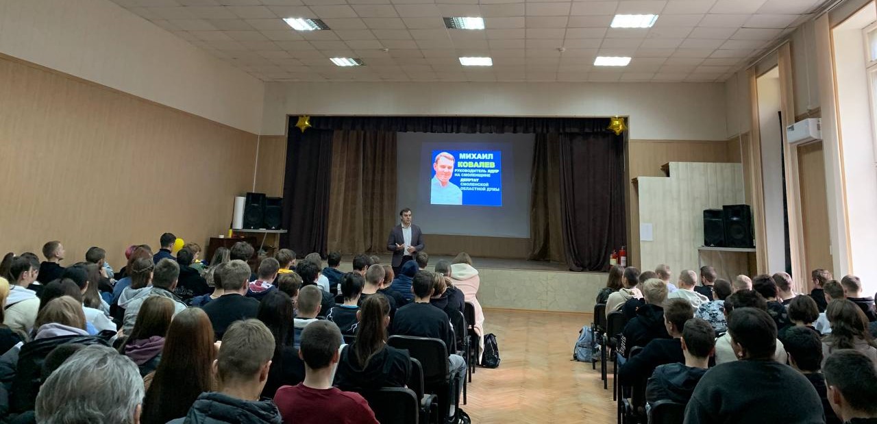 В этот раз руководитель ЛДПР на Смоленщине, депутат Смоленской областной Думы Михаил Ковалев вместе со своим заместителем по партии Владиславом Ульяновым и руководителем "Молодежки" Ангелой Яшиной встретился со студентами Смоленского техникума железнодорожного транспорта, связи и сервиса