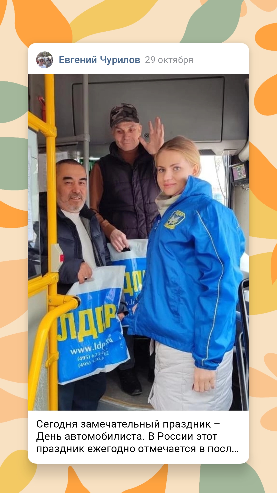 В прямом эфире в сети "ВК" Ханты-Мансийского регионального отделения партии активисты молодежного движения ЛДПР в Нижневартовске обратились ко всем автолюбителям и шоферам - профессионалам и поздравили с праздником - Днем автомобилиста, напомнив про суровые северные климатические особенности и безопасность на дорогах Югры