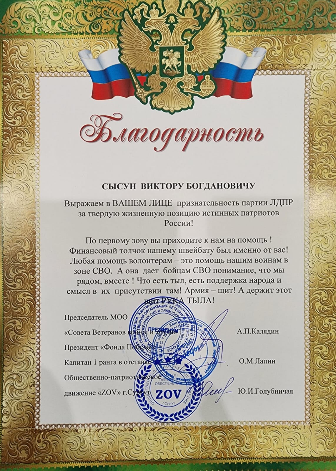 Сегодня в Сургуте в торжественной обстановке депутату ЛДПР Виктору Сысуну вручили благодарственное письмо от общественно-патриотического движения «ZOV», Совета ветеранов войны и труда и Фонда Победы