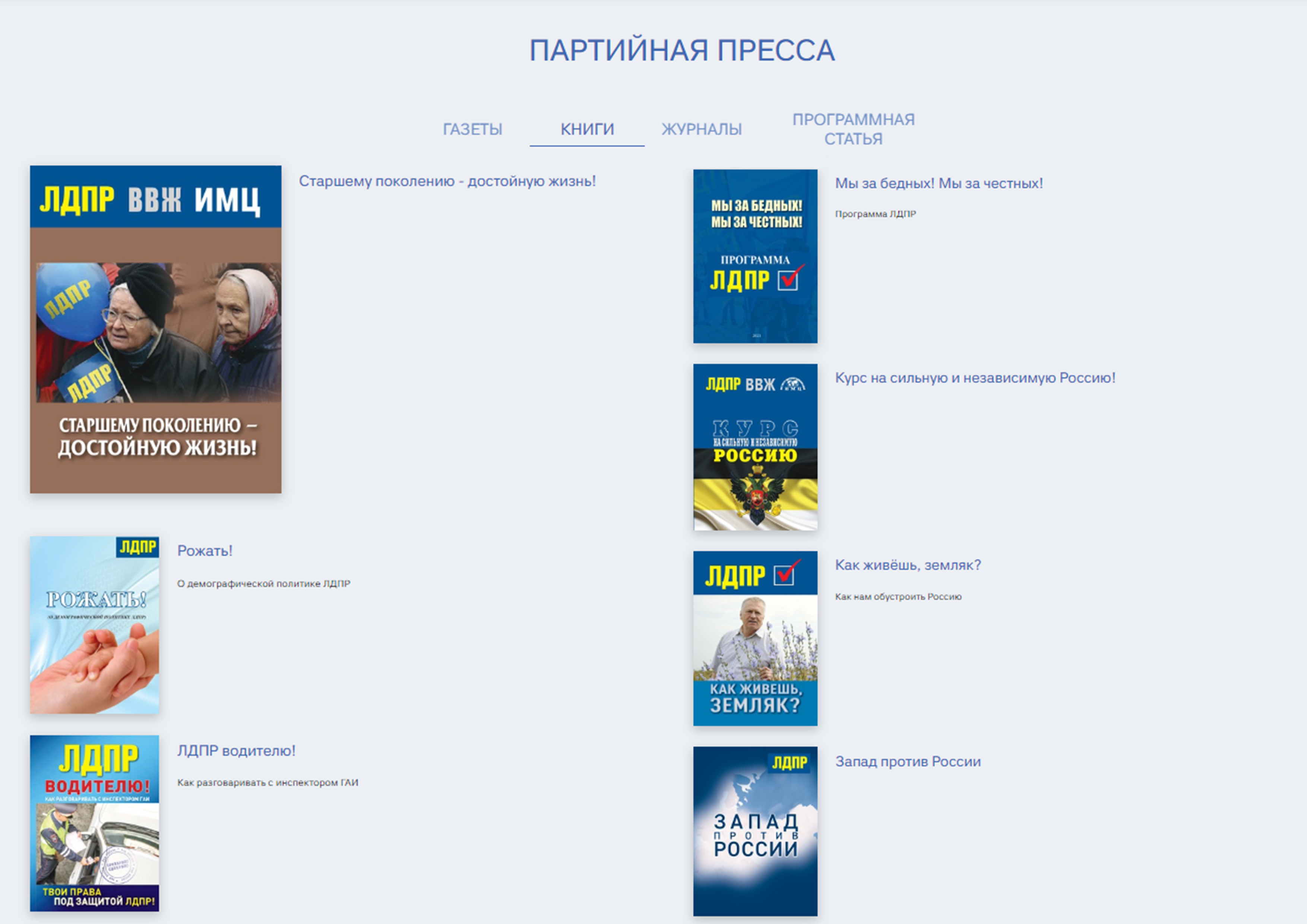 На сайте ЛДПР вы сможете не только быть в курсе последних новостей партии, но и ознакомиться с множеством другой полезной информации. Заглянув в раздел пресса, вы обнаружите электронные версии газет, журналов и брошюр ЛДПР