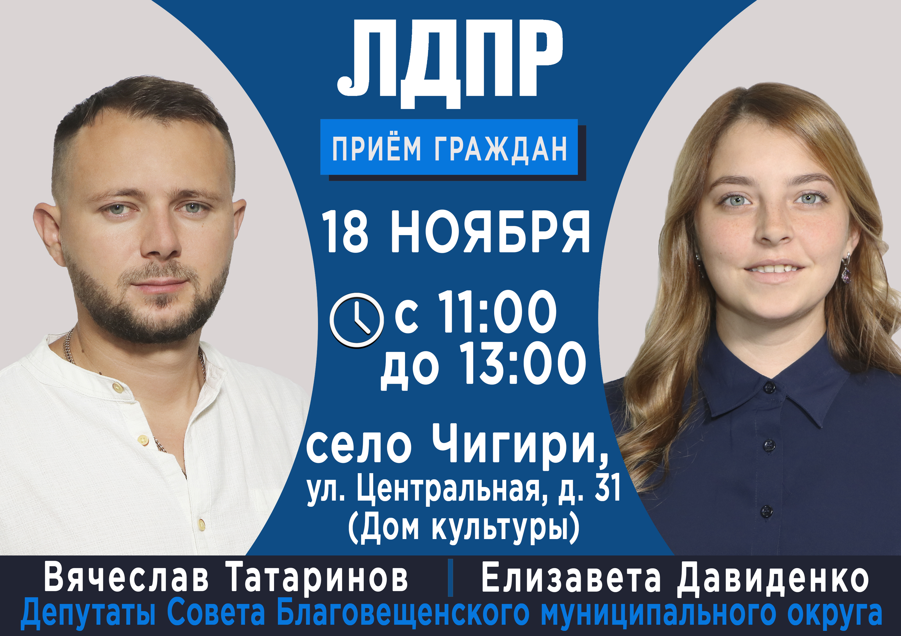 18 ноября мы приглашаем всех желающих посетить встречу с представителями фракции ЛДПР в Совете народных депутатов Благовещенского муниципального округа Елизаветой Давиденко и Вячеславом Татариновым