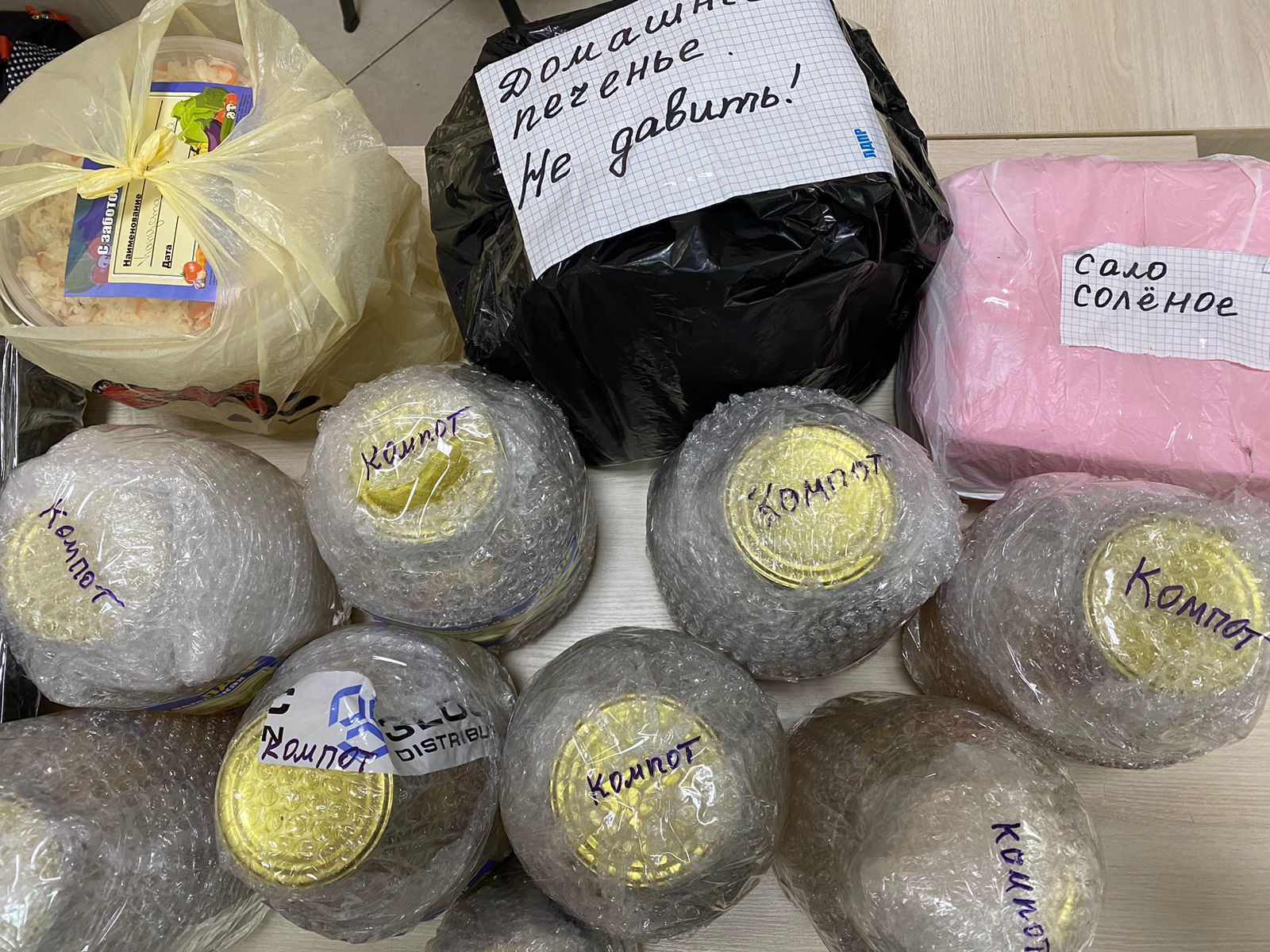 В посылку для бойцов от Людмилы Харченко вошло 40 пар вязаных носков, 11 вязаных шапок, 5 килограмм квашеной капусты, которую женщина солила собственноручно и столько же килограмм домашнего сала, 8 трехлитровых банок компота, варенье, домашнее печенье.