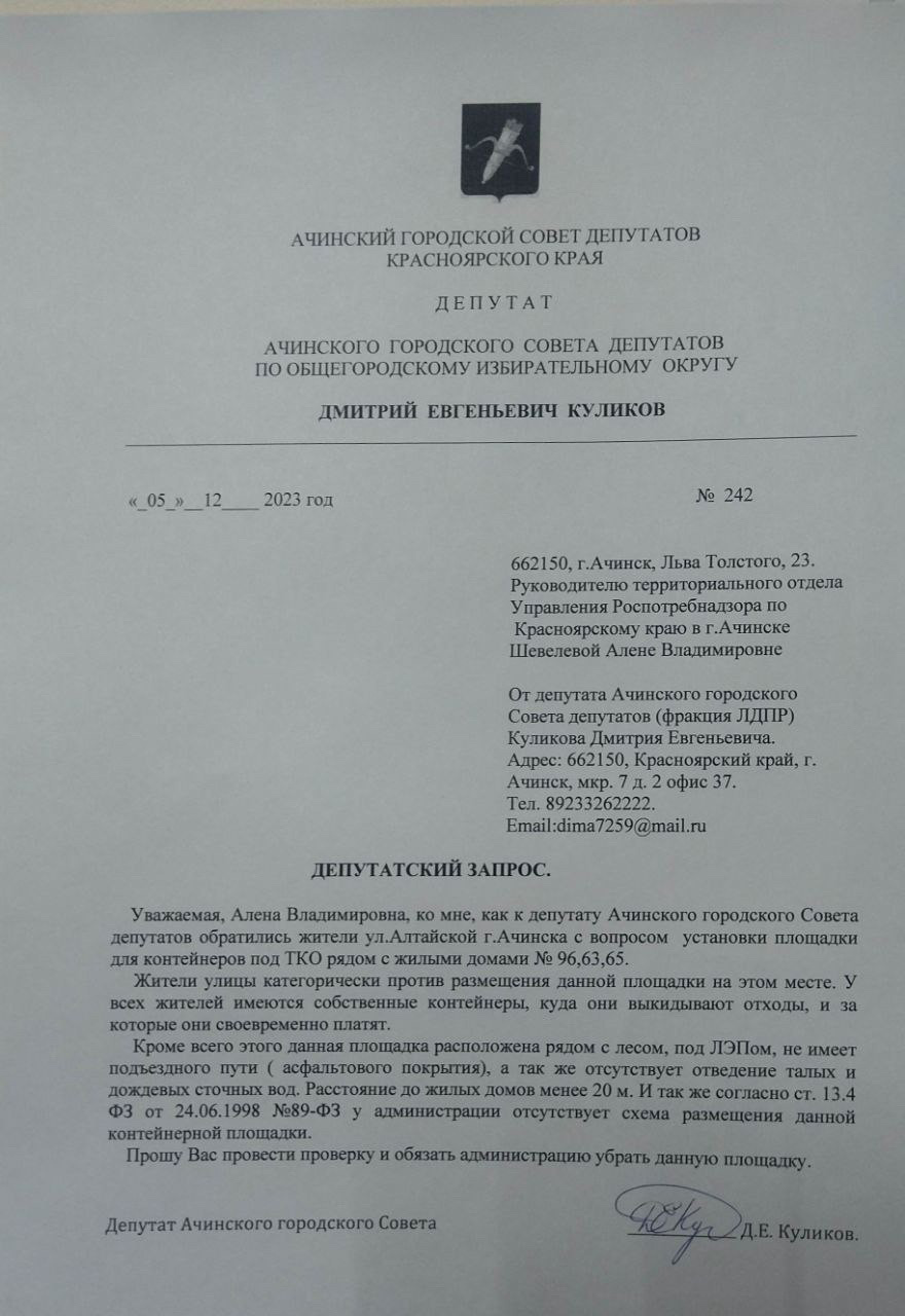 Депутат ЛДПР обратился в Роспотребнадзор, попросил провести проверку и обязать администрацию убрать мусорную площадку. Народный избранник задается вопросом, когда власть начнет слышать жителей города и прислушиваться к их потребностям и нуждам?