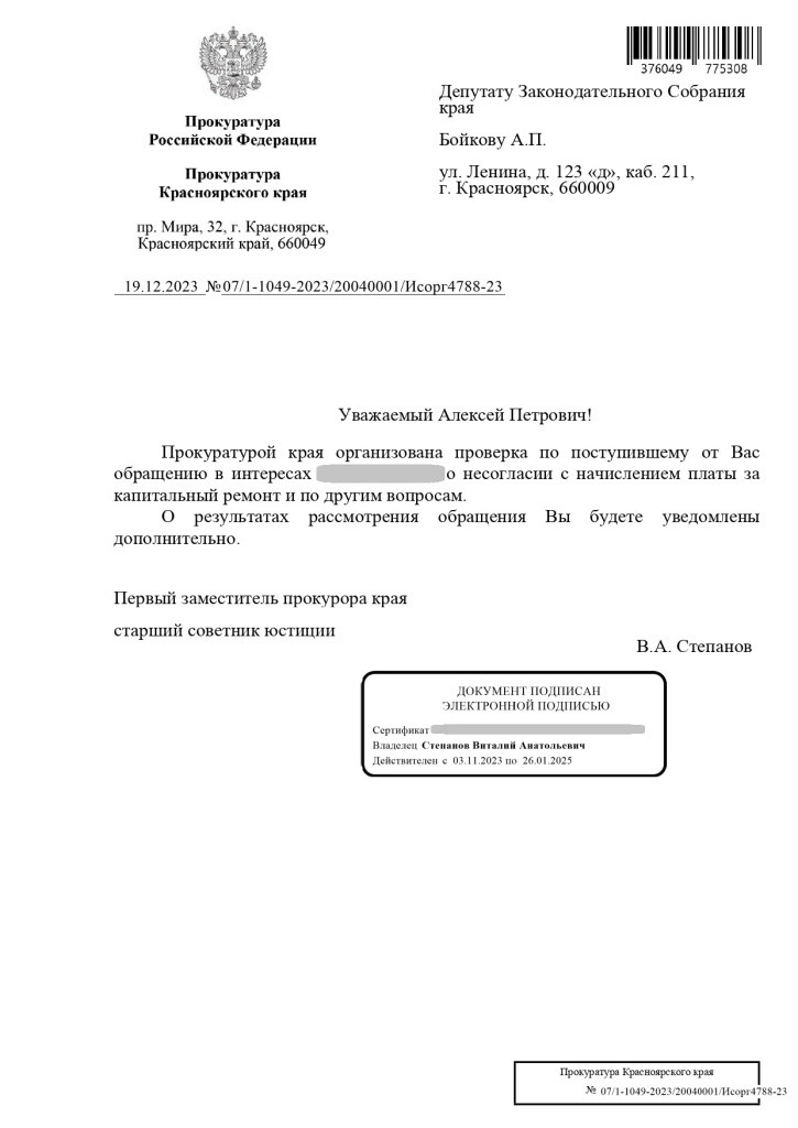 Прокуратура проверит обоснованность долга за капремонт у семьи из Сосновоборска