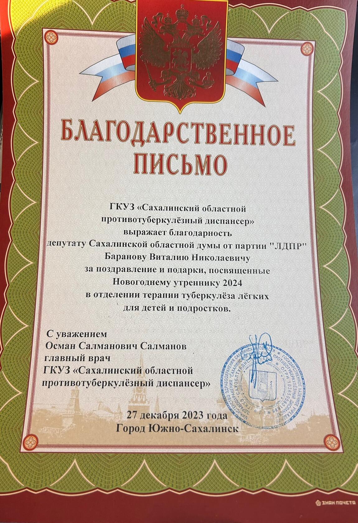 В процессе мероприятия главный врач ГКУЗ «Сахалинского противотуберкулезного диспансера», Осман Салманов, выразил свою благодарность Виталию Баранову за теплые поздравления и подарки для детей и подростков, а также вручил ему благодарственное письмо. Это подтверждение того, что такие акции приносят радость и надежду в сердца детей, которые находятся в трудной ситуации из-за болезни.