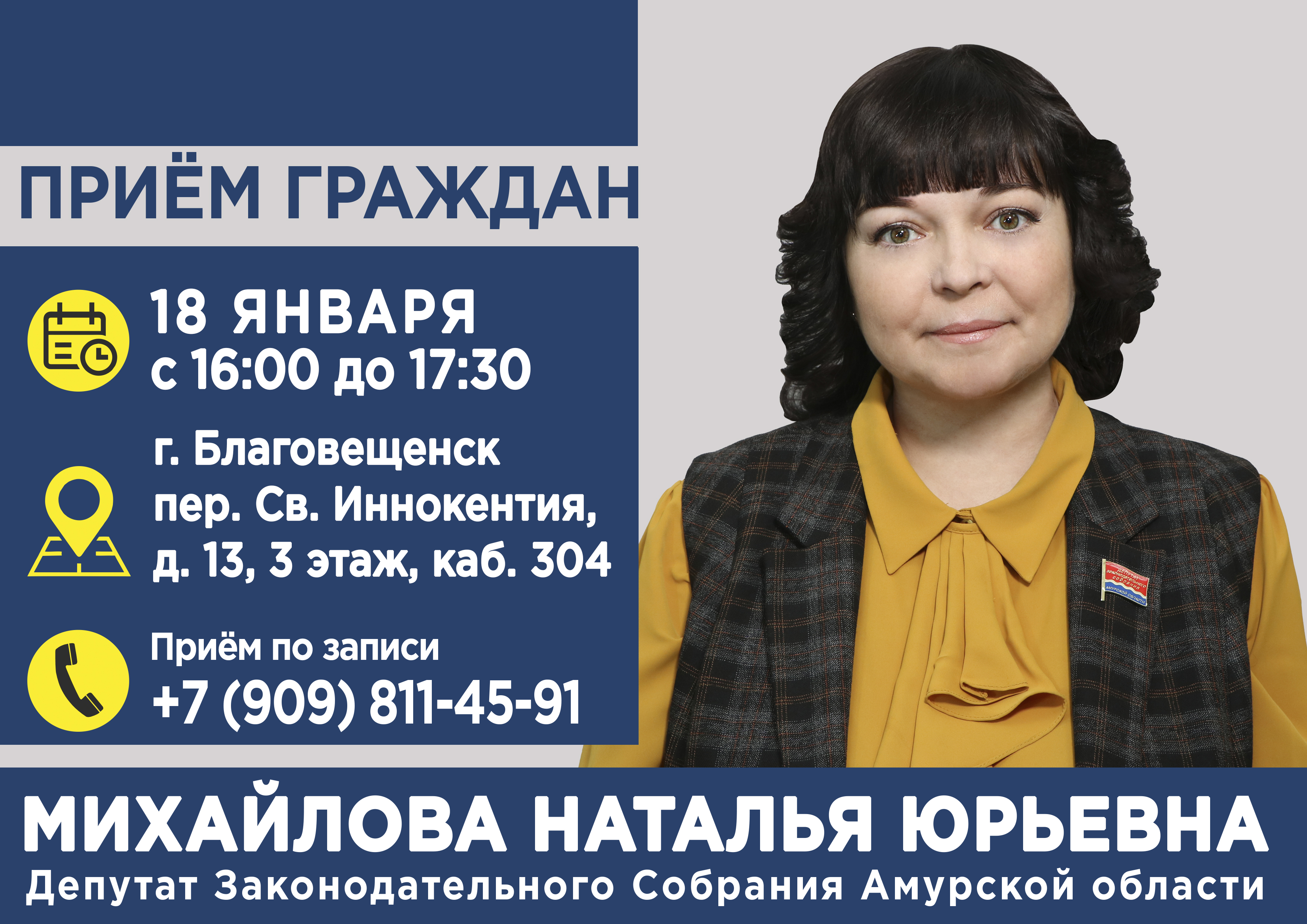 18 января с 16:00 до 17:30 депутат Законодательного Собрания Амурской области Наталья Михайлова проведёт приём граждан по адресу: г. Благовещенск, переулок Святителя Иннокентия, д. 13, 3 этаж, каб. 304