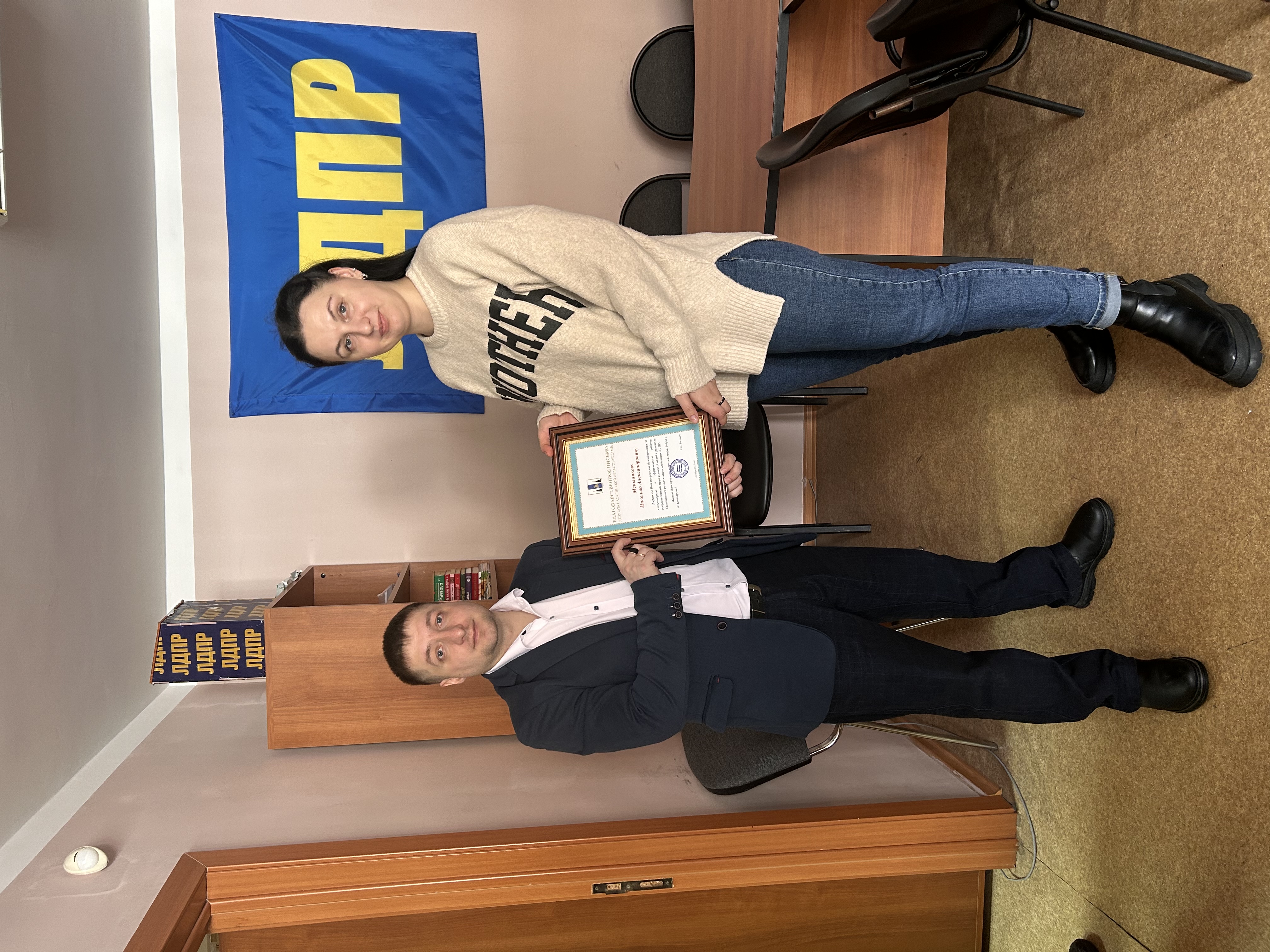 Помощник депутата Сахалинской областной Думы от ЛДПР Анна Федоренко от имени Виталия Баранова торжественно вручила благодарственное письмо Николаю Меньшикову