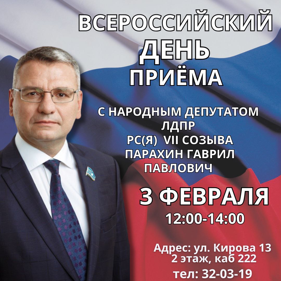 В Якутске встречу проведет народный депутат Республики Саха (Якутия) VII созыва Гаврил Парахин с 12.00 до 14.00 по адресу Кирова 13, 2 этаж, каб. 222.