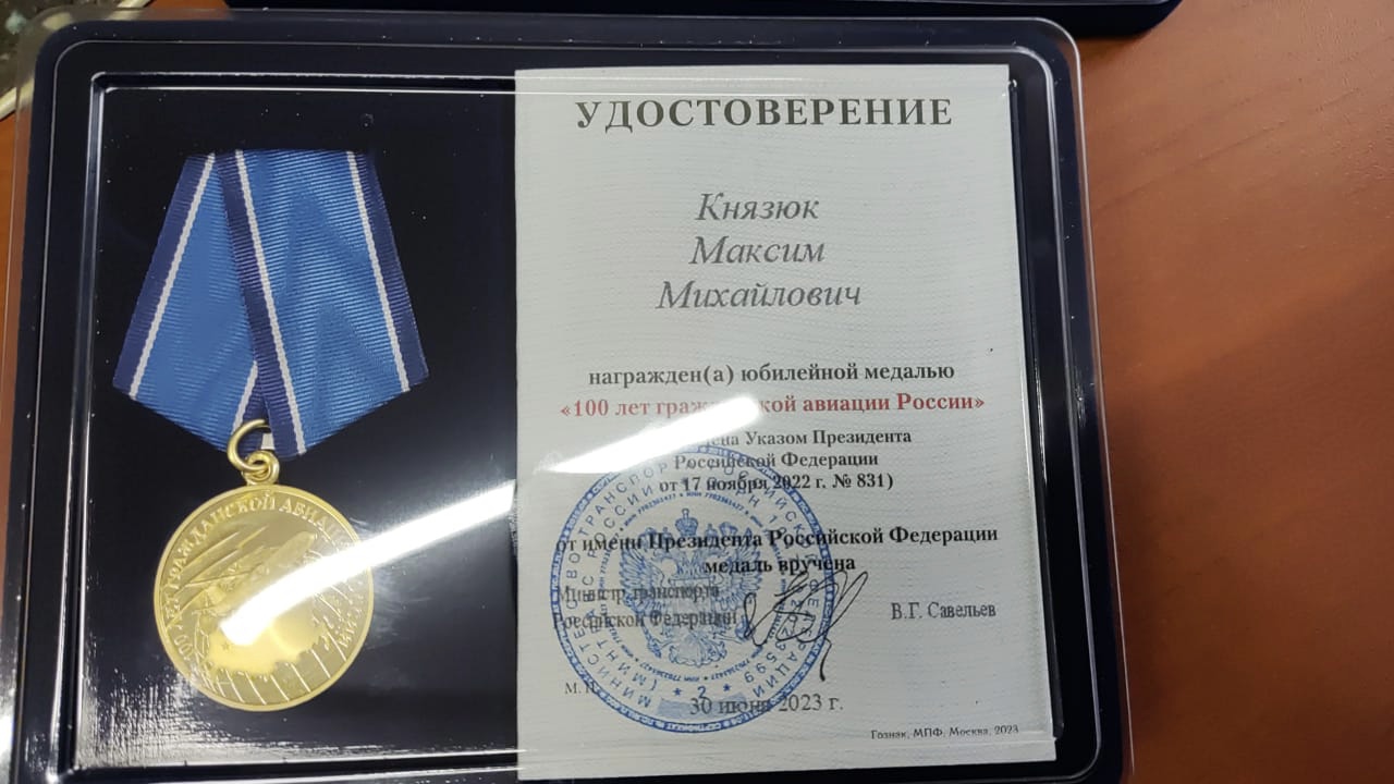 ЛДПР в аэронавигации: за многолетний труд и безупречную службу депутат Максим Князюк получил юбилейную медаль "100 лет гражданской авиации"