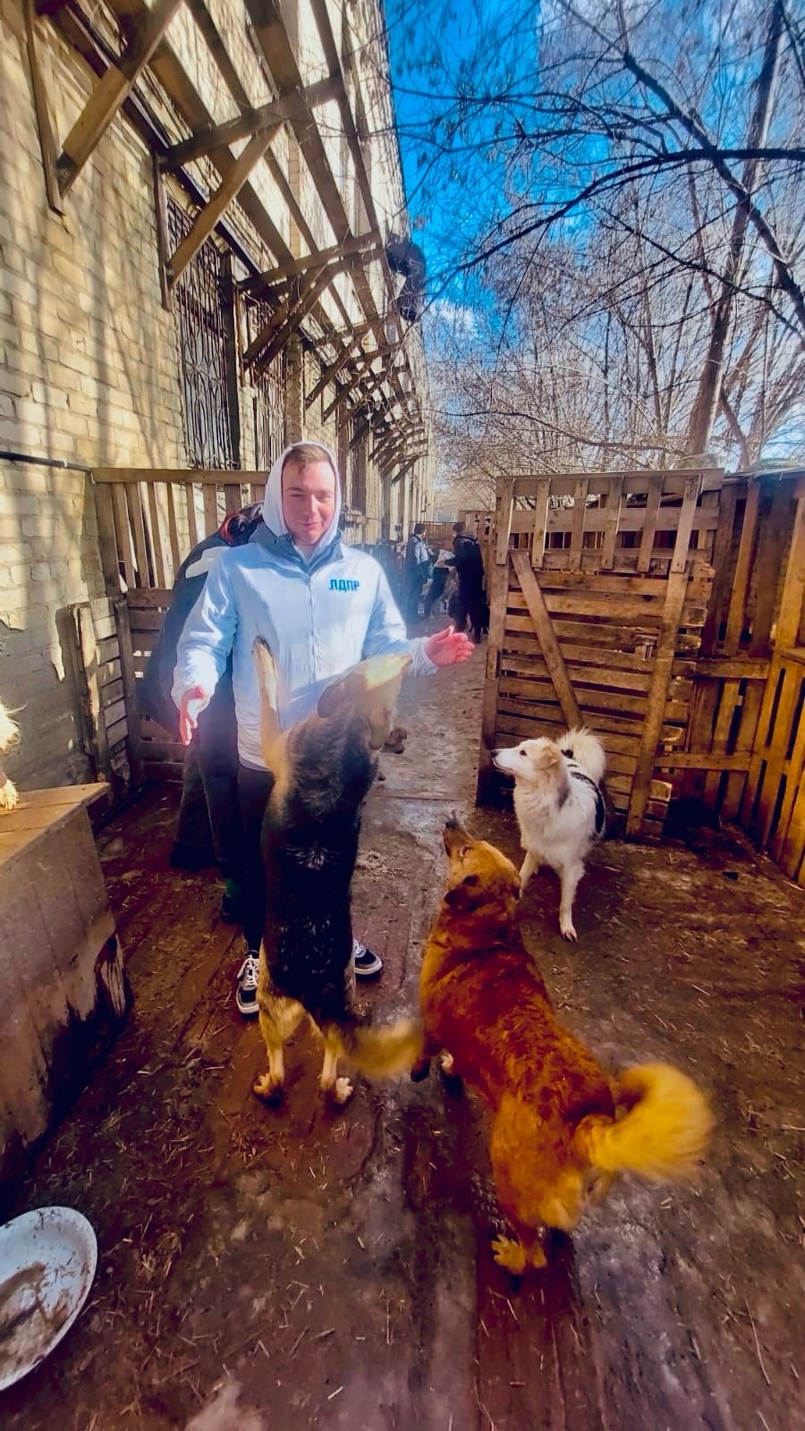 Активисты ЛДПР пришли в приют с кормом и лакомствами для собак. Они вышли с ними на прогулку и организовали игры, чтобы развлечь животных и поддержать их физическую форму.