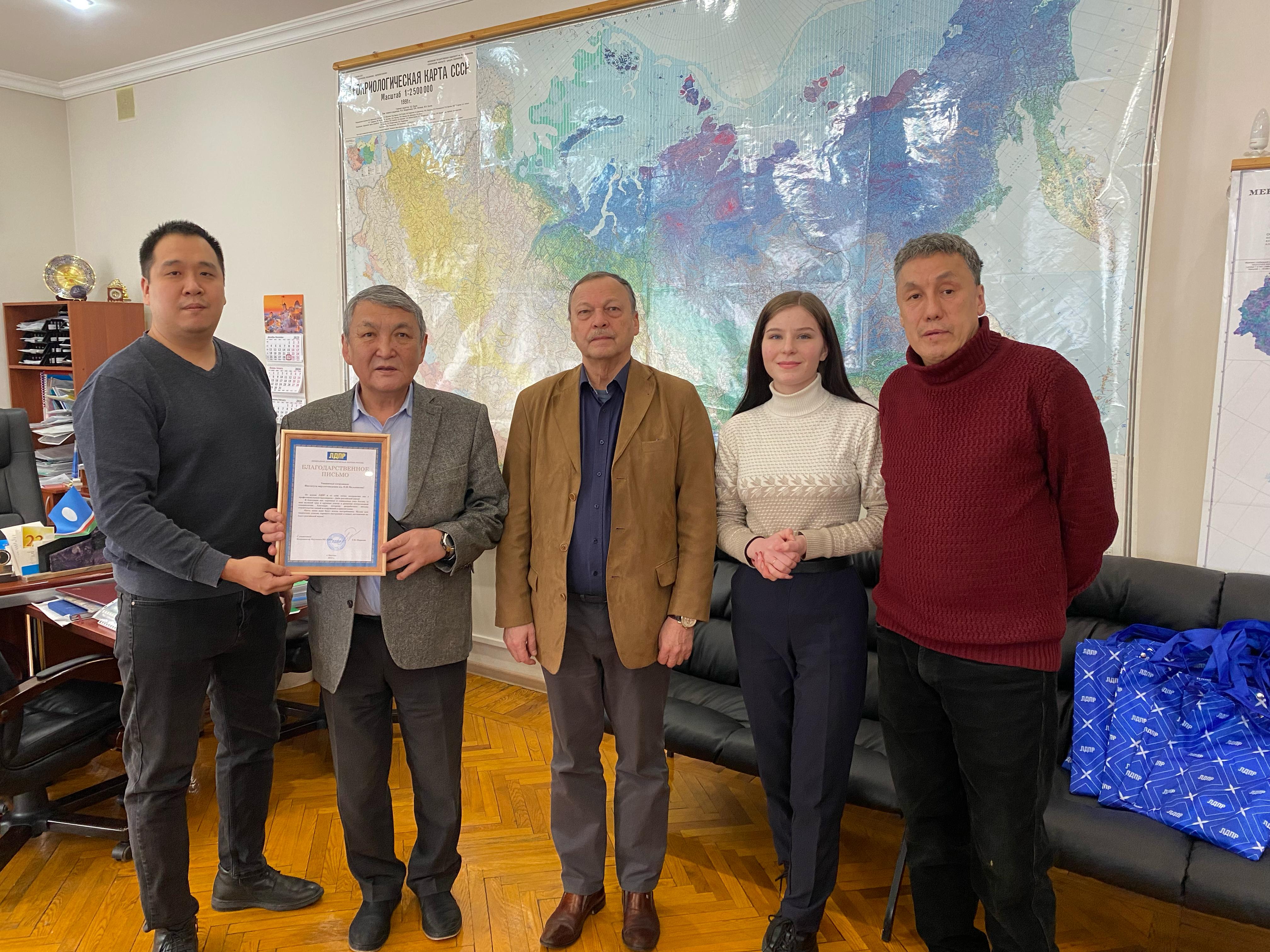 Научным сотрудникам вручили благодарственное письмо от координатора Якутского регионального отделения ЛДПР Гаврила Павловича Парахина.