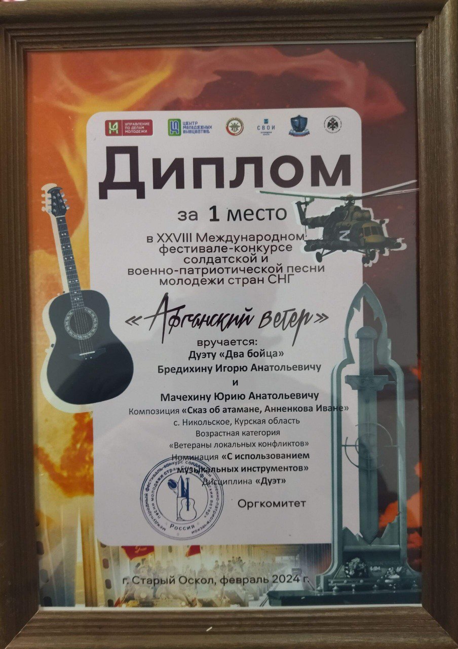 В мероприятии принял участие наш партиец, депутат, руководитель АНО «Центр патриотического воспитания Игорь Бредихин. За исполнение композиций «Про хохла Мыколу» и «Сказ об атамане, Анненкова Иване» получил Дипломы за 1 место.