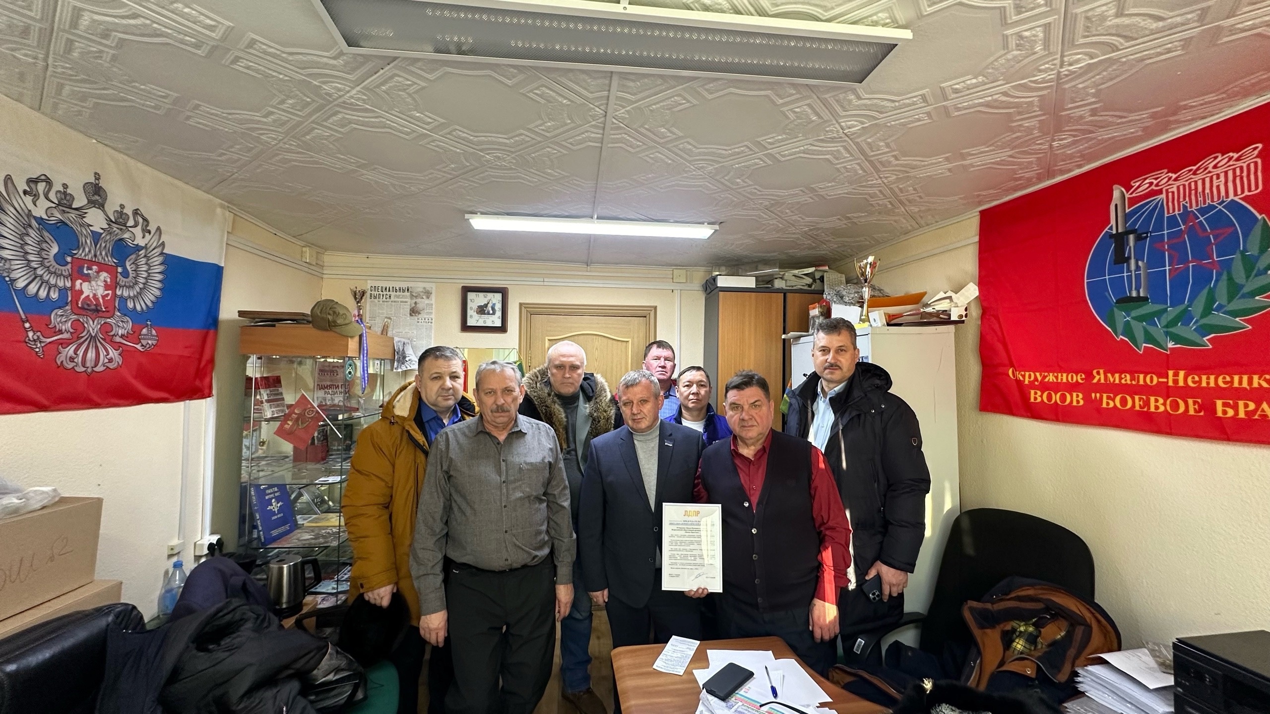 Депутат Законодательного Собрания ЯНАО Александр Голубенко и доверенное лицо Леонида Слуцкого Сергей Вануйто встретились с коллективом Ямало-Ненецкого отделения Всероссийской общественной организации ветеранов «Боевое Братство» и вручили приветственный адрес от Председателя ЛДПР.