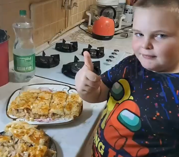 На этот раз он приготовил пирог с мясом и капустой. Блюдо мальчик посвятил своему старшему брату Борису, который служил в армии и дедушке Сергею Бурштейну – он неоднократно выступает со своими авторскими песнями на передовой, поднимая боевой дух военнослужащих.