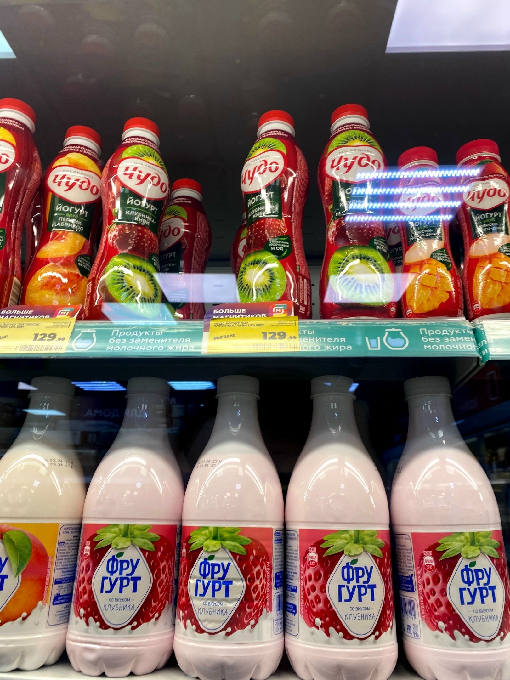 Еще из интересного: Один йогурт в простой упаковке и 950 мл., а другой в яркой обёртке 680 г., но по стоимости примерно одинаковы. Зато Васьковский молокозавод из Починка продает литр, обратил внимание Ульянов.