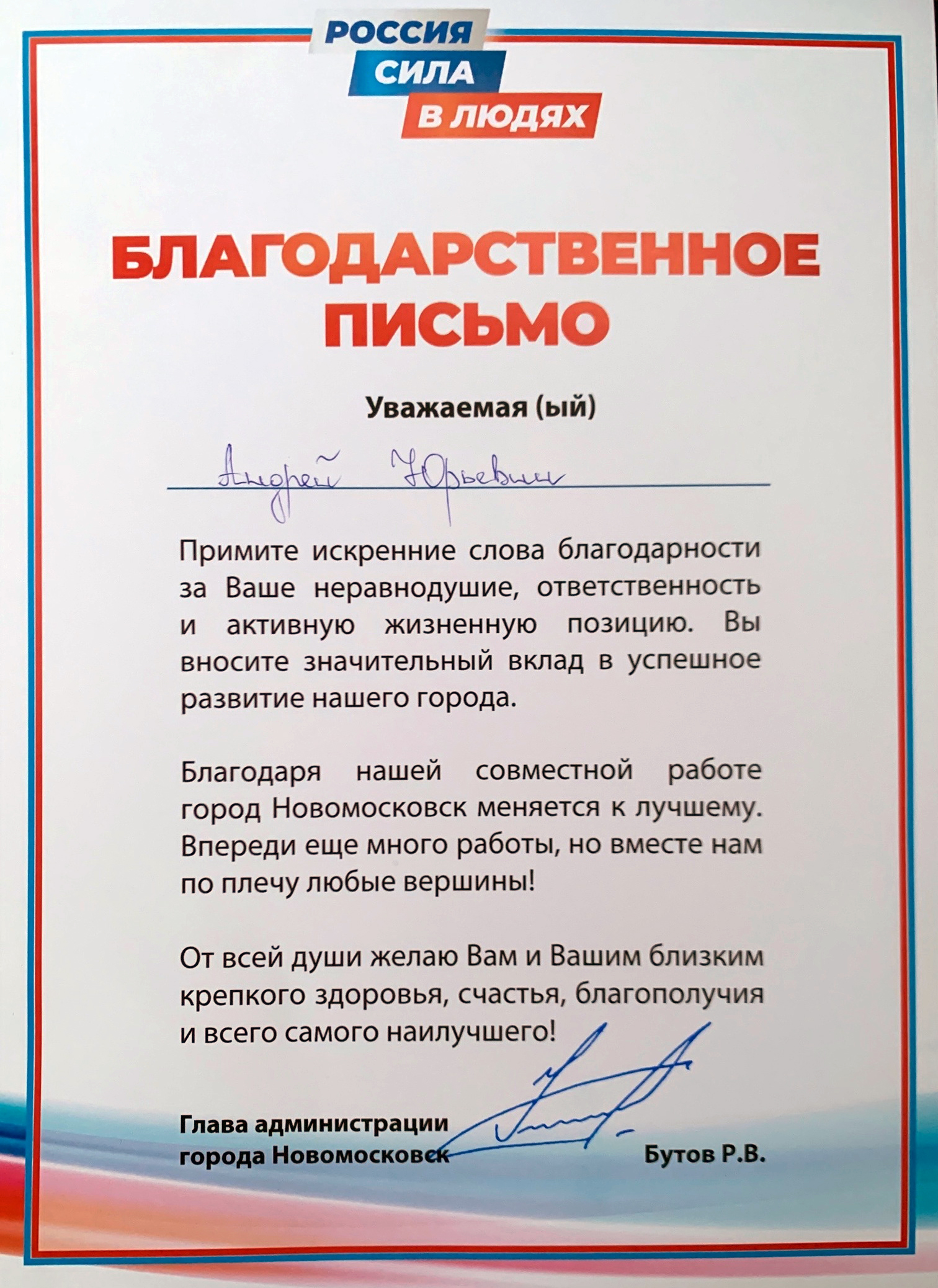 «Благодаря нашей совместной работе город Новомосковск меняется к лучшему. Впереди еще много работы, но вместе нам по плечу любые вершины!