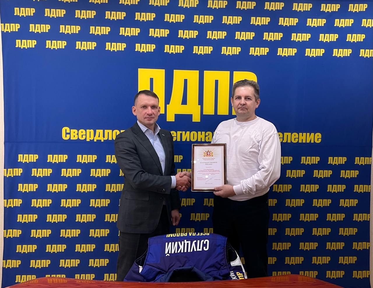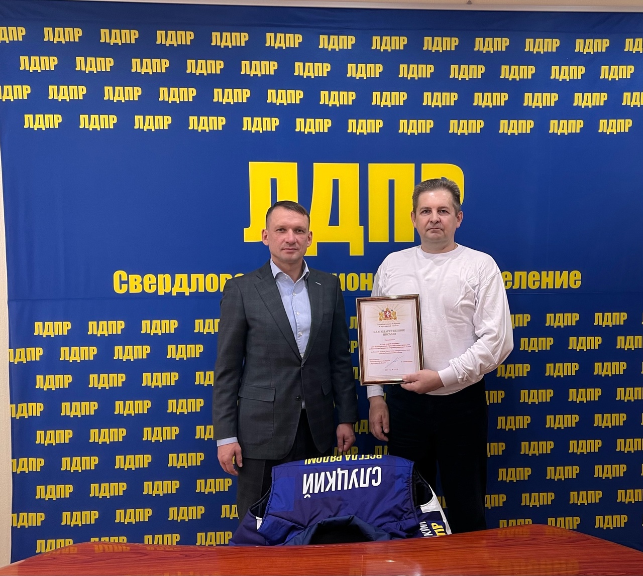 Координатор Свердловского регионального отделения ЛДПР, депутат Законодательного Собрания Свердловской области Александр Каптюг вручил Благодарственное письмо Законодательного Собрания Свердловской области члену Первоуральской городской территориальной избирательной комиссии с правом решающего голоса Андрею Сухову за большой вклад в обеспечение избирательных прав граждан России