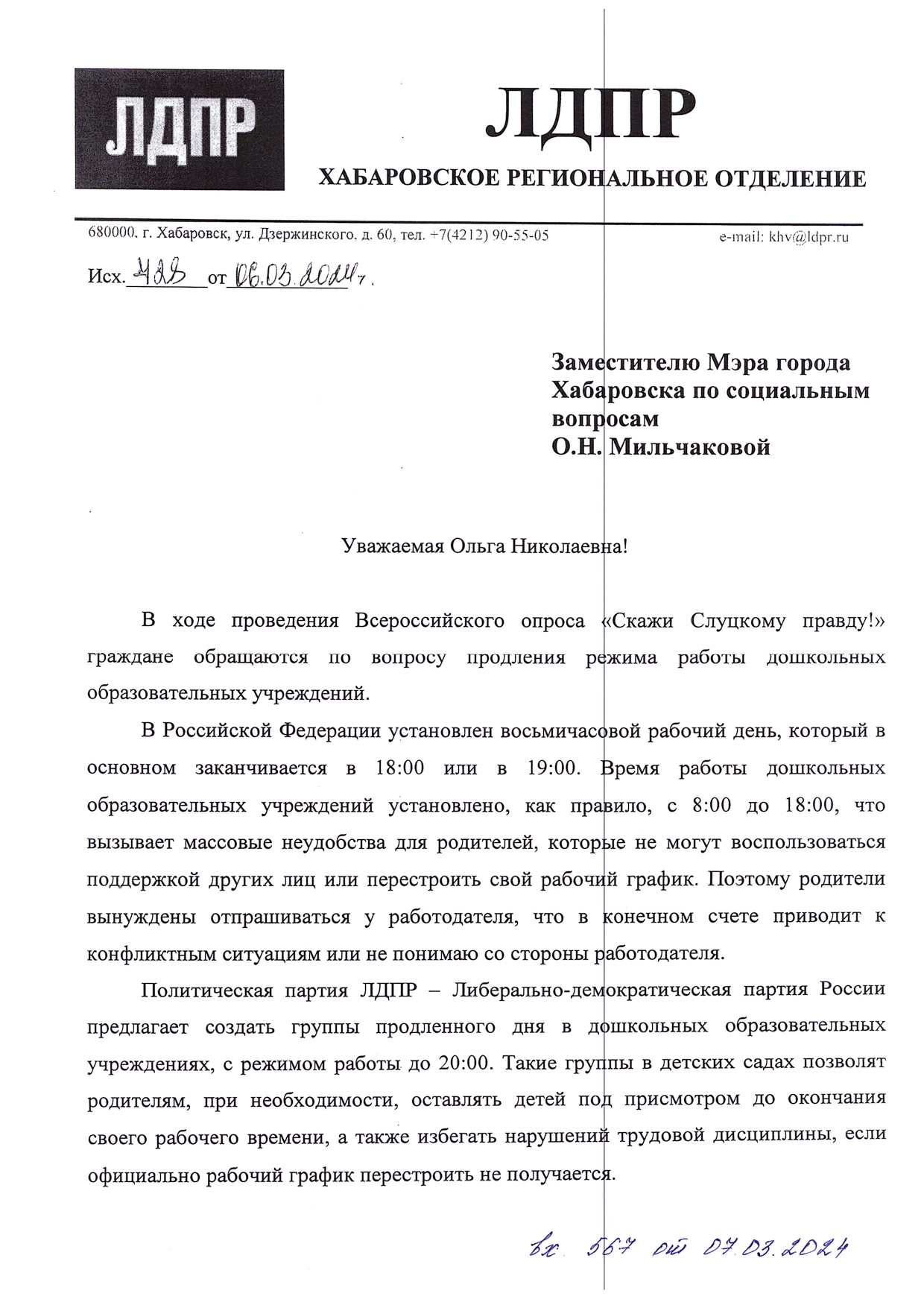 Заместитель координатора Хабаровского регионального отделения ЛДПР Иван Рыбин предложил создать группы продлённого дня в дошкольных образовательных учреждениях с режимом работы до 20:00. По мнению партийца, это позволит родителям оставлять детей под присмотром воспитателей до окончания рабочего дня и избежать нарушения трудовой дисциплины