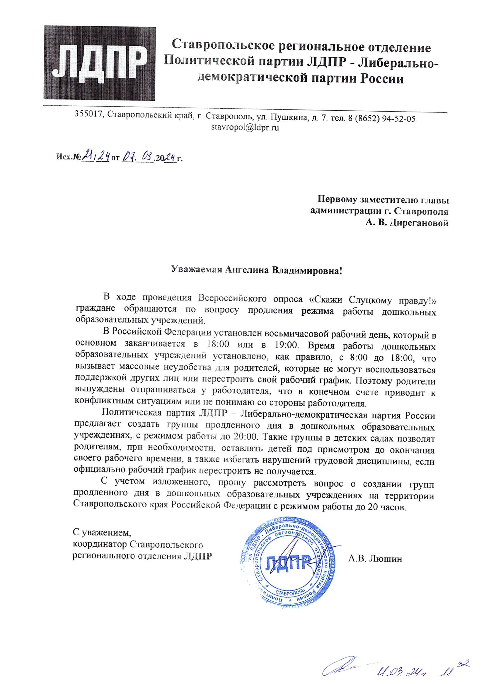 Координатор Ставропольского регионального отделения ЛДПР Александр Люшин предложил создать группы продлённого дня в дошкольных образовательных учреждениях с режимом работы до 20:00