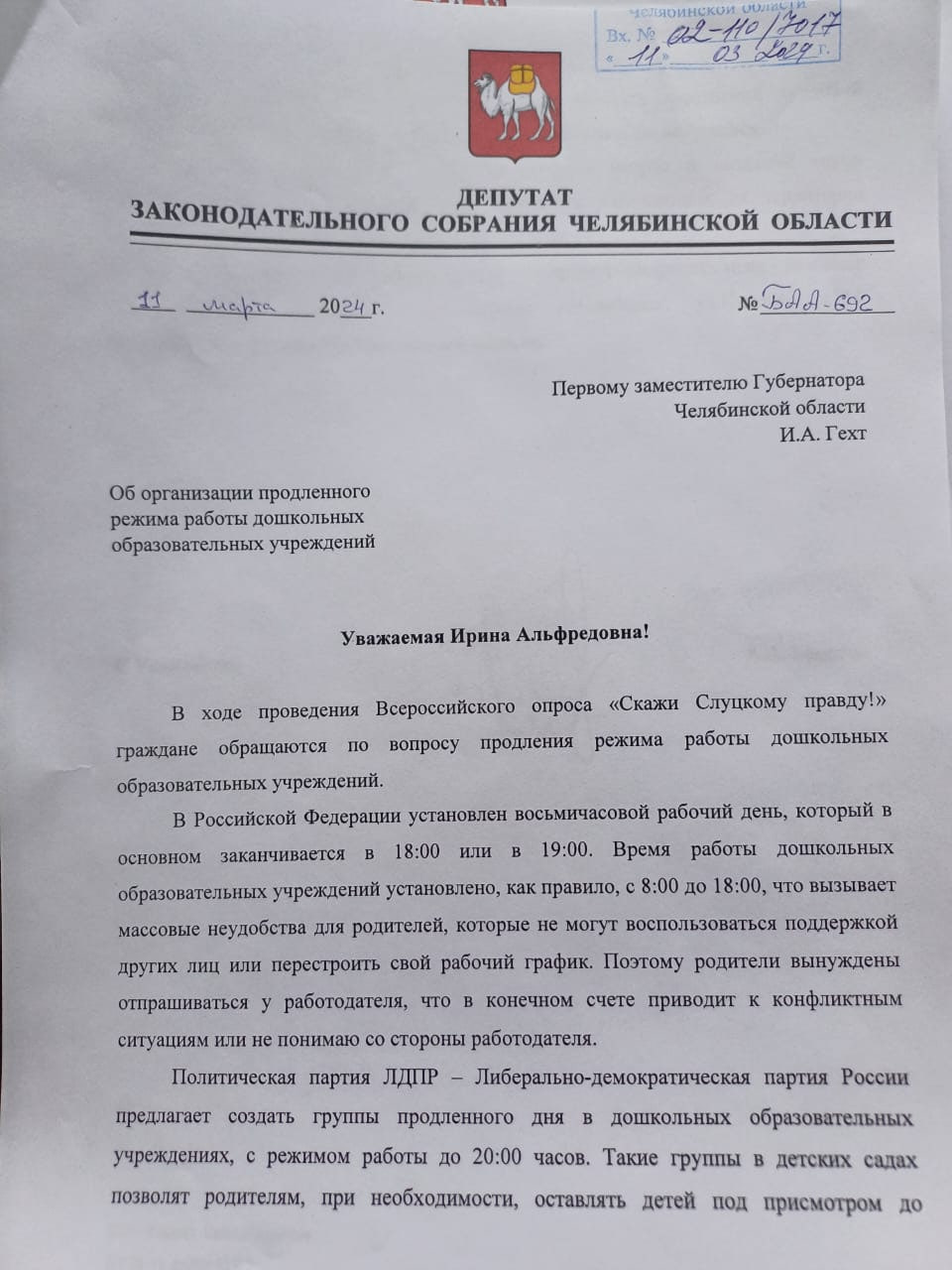 Руководитель фракции ЛДПР в Законодательном Собрании Челябинской области Алексей Беседин направил письмо с предложением создать группы продленного дня в детских садах в Правительство региона