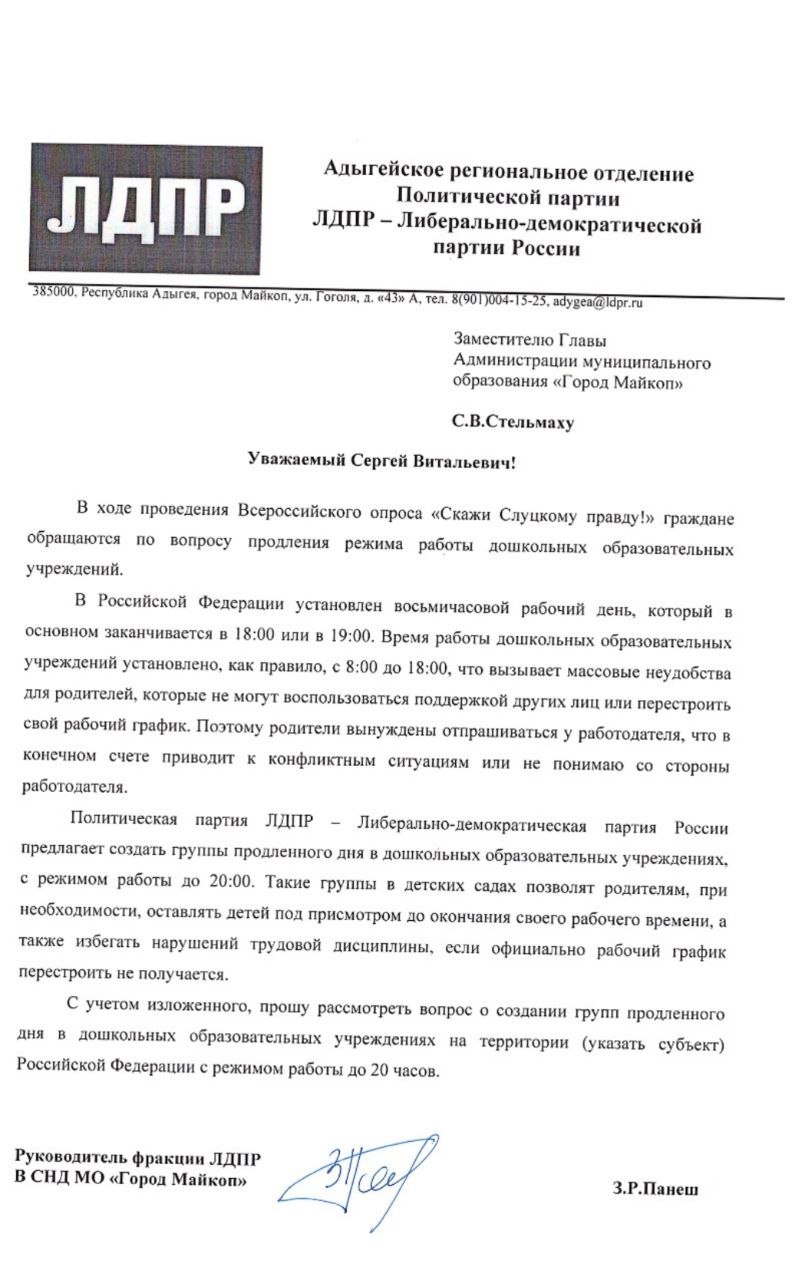 В ходе проведения Всероссийского опроса граждан «Скажи Слуцкому правду!» жители обращаются по вопросу продления режима работы дошкольных образовательных учреждений. По мнению Заура Руслановича, группы продлённого дня позволят родителям спокойно выполнять свои дела, быть уверенными, что ребёнок находится под присмотром, не портить отношения с работодателем и получать заработную плату в полном объёме.