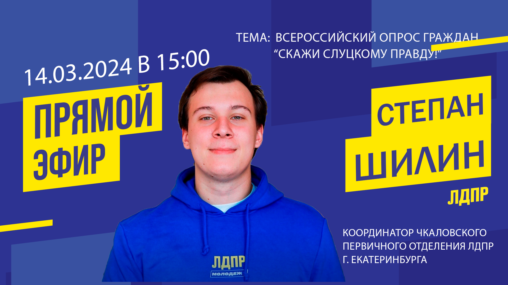 14 марта в штабе Свердловского регионального отделения ЛДПР на онлайн-площадке VK состоится прямой эфир на тему: «Всероссийский опрос граждан «Скажи Слуцкому правду!». Проведет эфир и ответит на ваши вопросы координатор Верх-Исетского первичного отделения ЛДПР г. Екатеринбурга Степан Шилин
