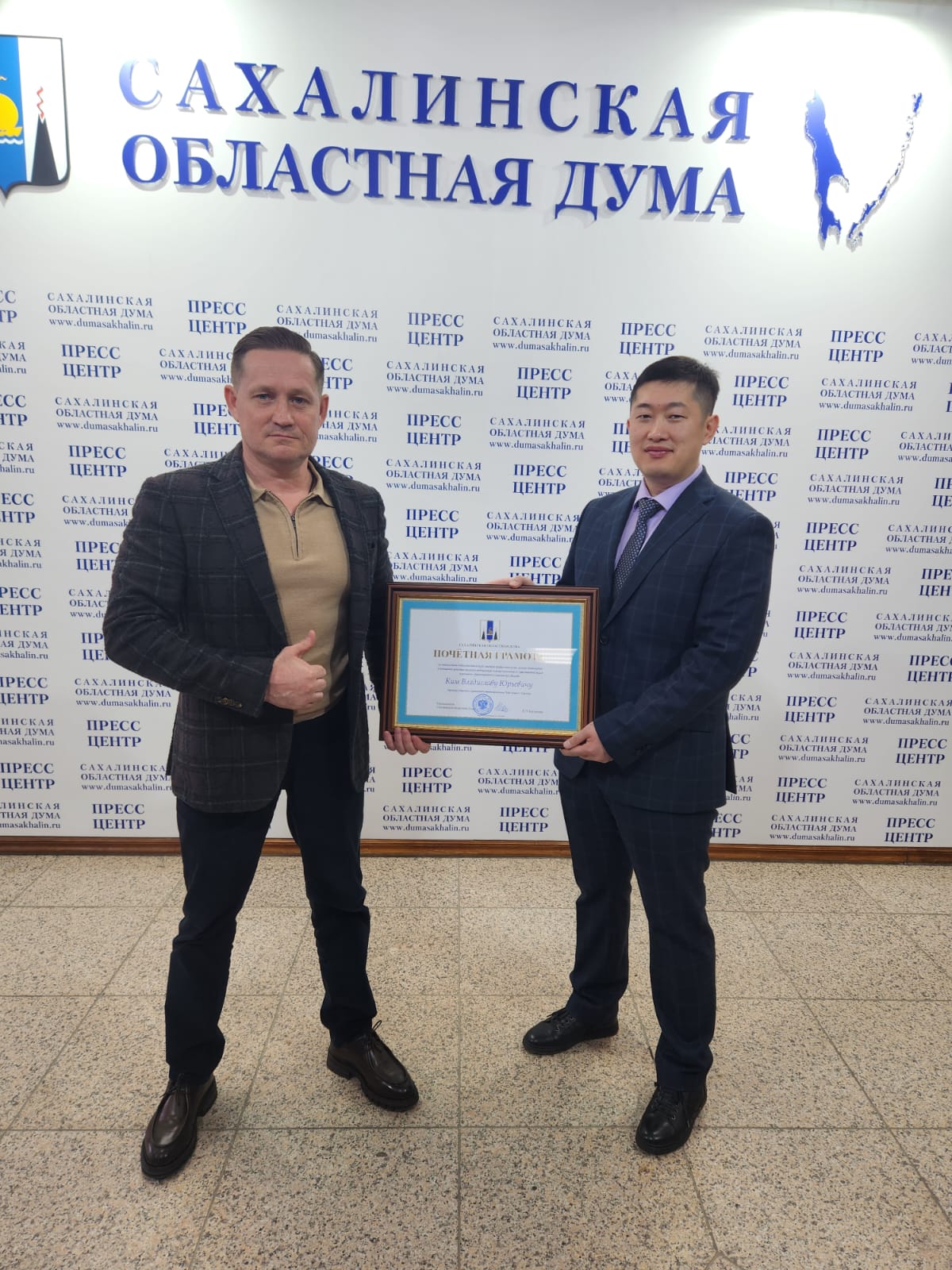 Депутат Сахалинской областной Думы от ЛДПР, Виталий Баранов, вручил почетную грамоту директору ООО «Будь здоров» г. Корсаков, Ким Владиславу Юрьевичу