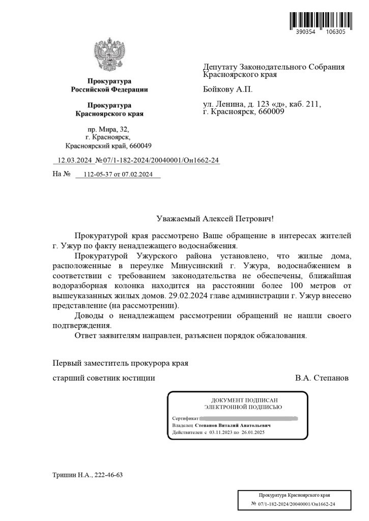 После депутатского запроса провели прокурорскую проверку, которая установила, что администрация Ужура не выполняет обязательства по обеспечению населения водоснабжением. Глава Ужура получил представление от прокуратуры района.