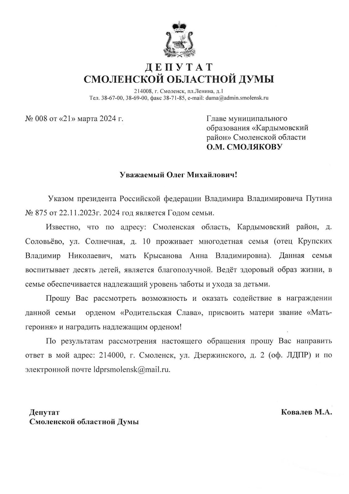 Михаил Ковалев направил главе Кардымовского района Олегу Смолякову обращение с просьбой оказать содействие в награждении семьи орденом «Родительская слава», а также в присвоении Анне Владимировне звания «Мать - героиня». В ЛДПР надеются на поддержку инициативы.
