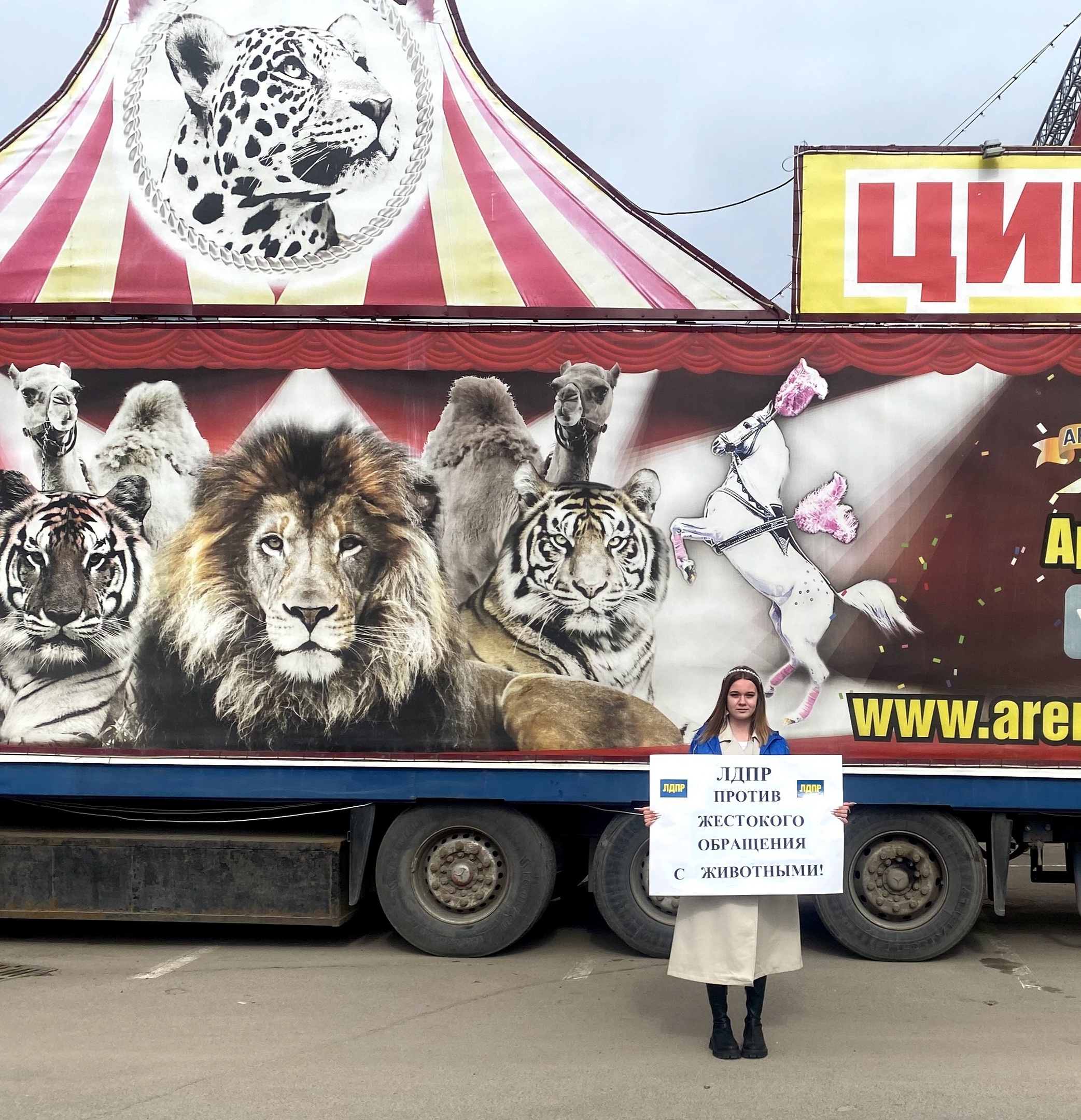 Партийцы провели одиночные пикеты у передвижного шапито, расположенного на парковке у одного из торговых центров Смоленска, чтобы обратить внимание на содержание животных в цирках
