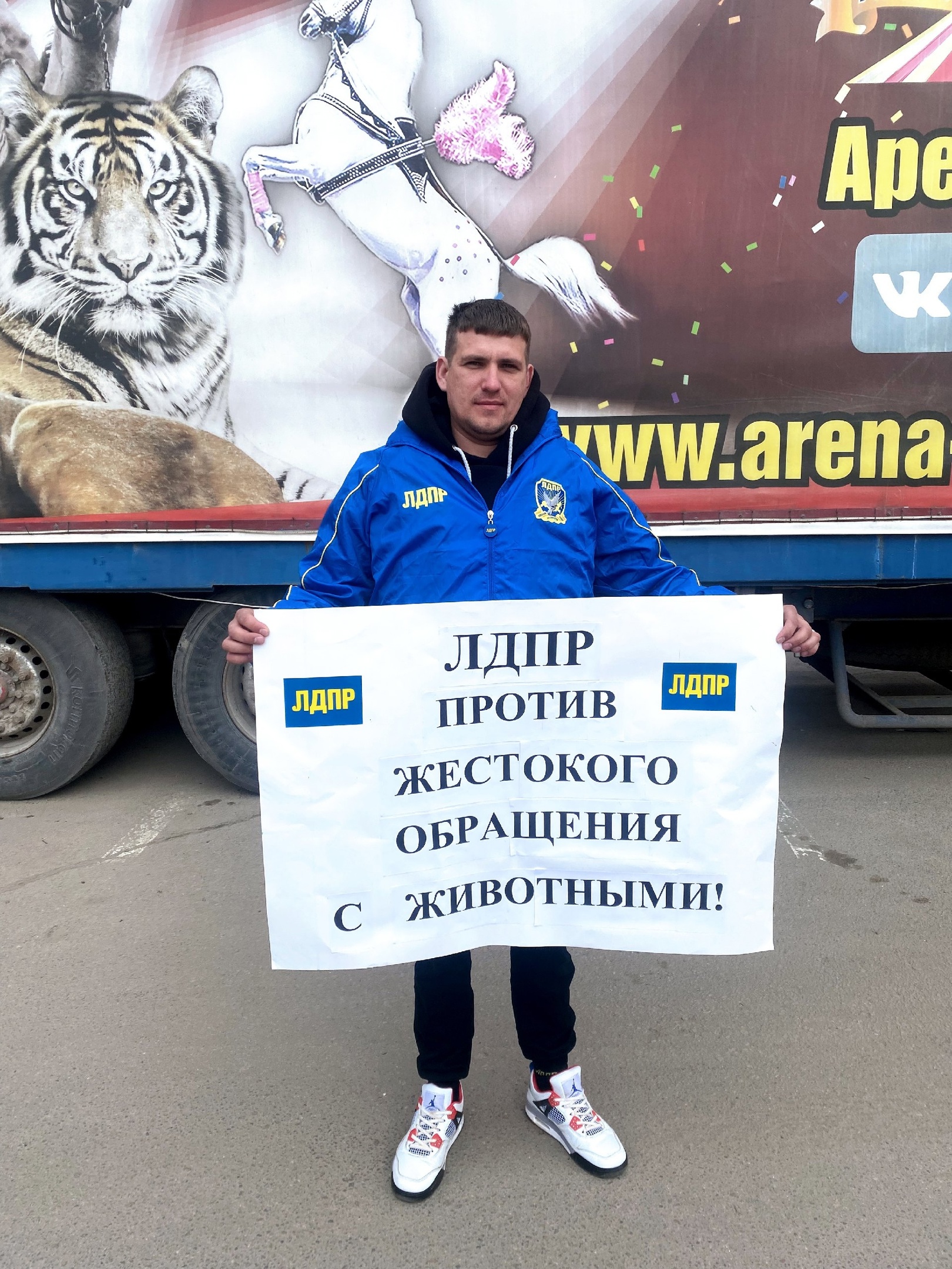 Партийцы провели одиночные пикеты у передвижного шапито, расположенного на парковке у одного из торговых центров Смоленска, чтобы обратить внимание на содержание животных в цирках