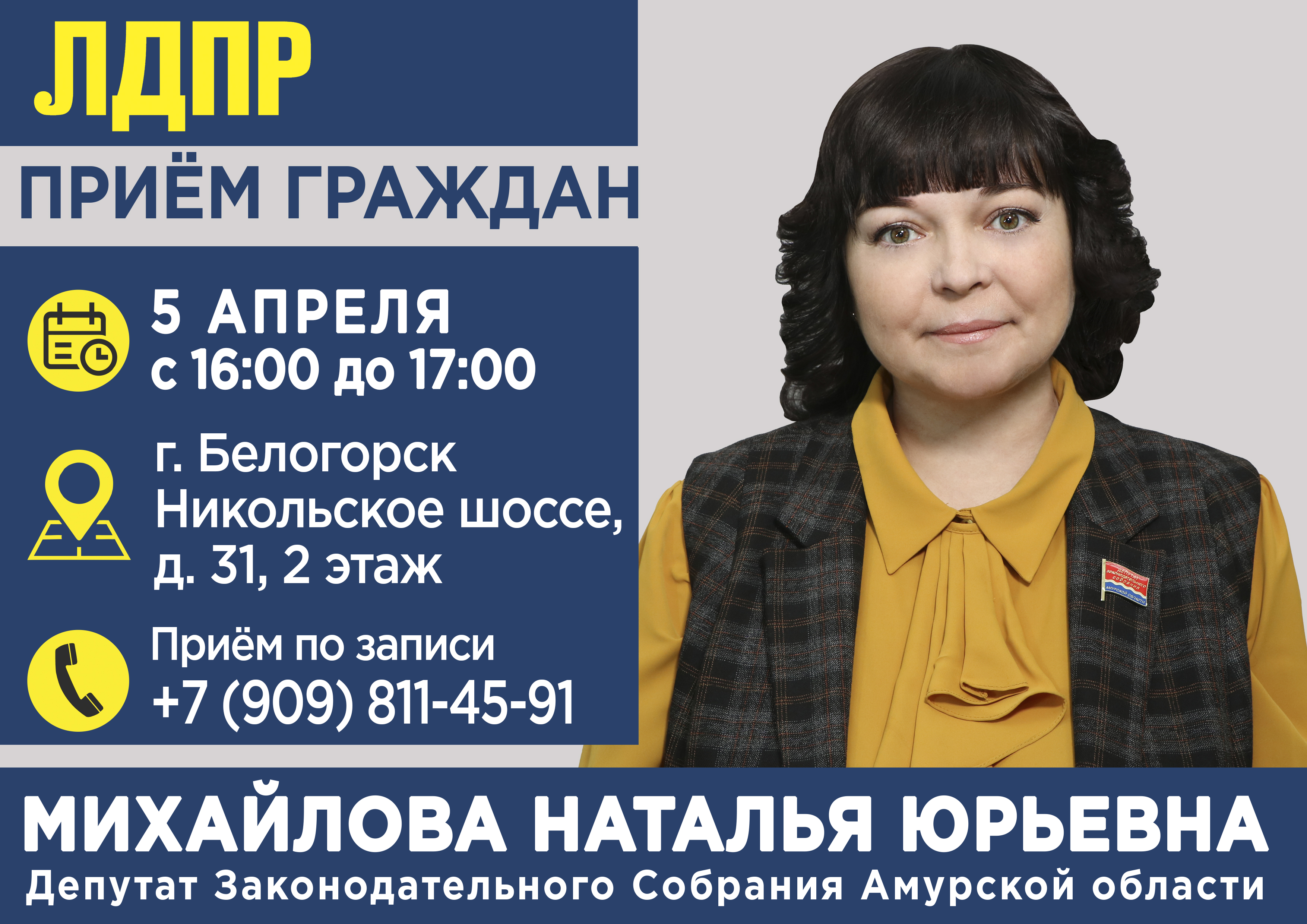 5 апреля с 16:00 до 17:00 руководитель фракции ЛДПР в областном Заксобрании Наталья Михайлова проведёт приём граждан по адресу: г. Белогорск, Никольское шоссе, дом 31, 2 этаж