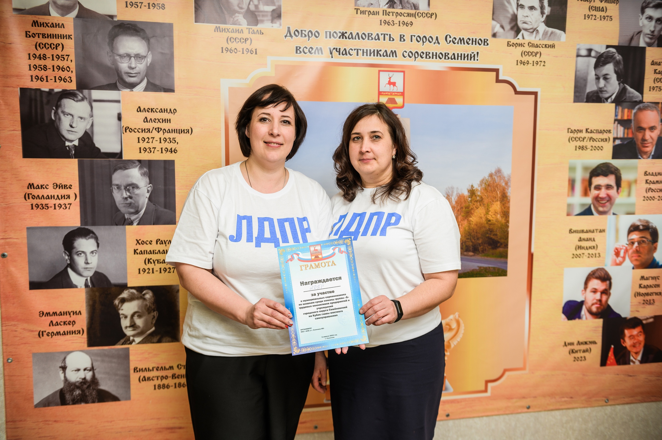 Активисты ЛДПР Елена Дельцова и Елена Цветкова приняли участие в муниципальных соревнованиях по шашкам среди 13 команд группы «Б» трудовых коллективов предприятий и учреждений городского округа Семеновский