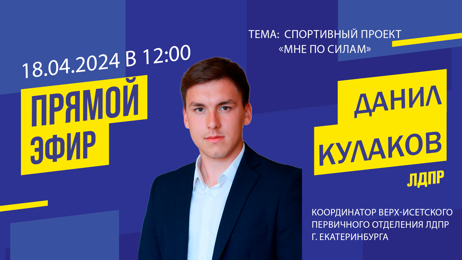 18 апреля в штабе Свердловского регионального отделения ЛДПР на онлайн-площадке VK состоится прямой эфир на тему спортивного проекта: «Мне по силам». Проведет эфир и ответит на ваши вопросы координатор Верх-Исетского первичного отделения ЛДПР г. Екатеринбурга Данил Кулаков