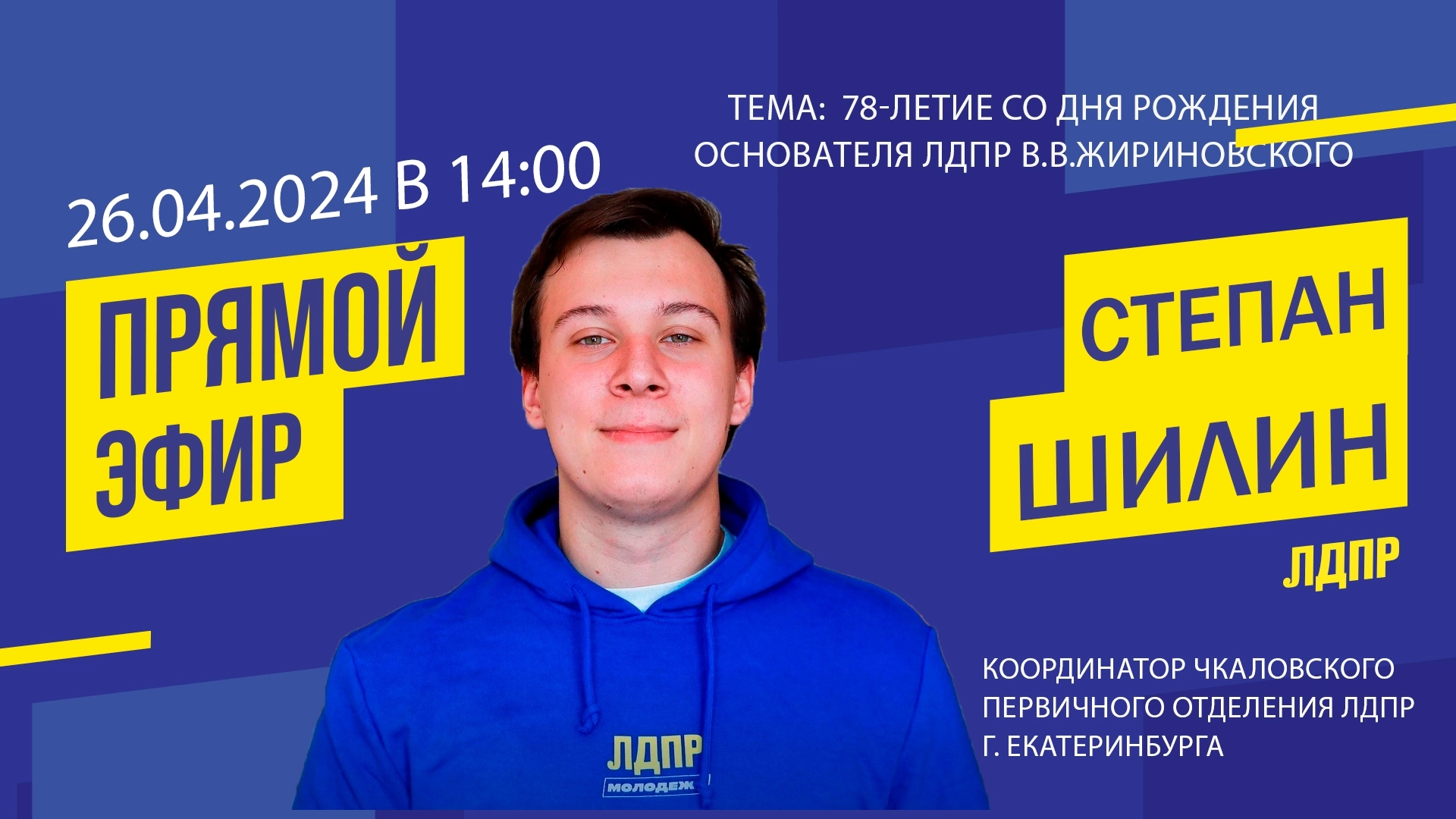 26 апреля в штабе Свердловского регионального отделения ЛДПР на онлайн-площадке VK состоится прямой эфир на тему 78-летия со дня рождения основателя ЛДПР В.В. Жириновского. Проведет эфир и ответит на ваши вопросы координатор Чкаловского первичного отделения ЛДПР г. Екатеринбурга Степан Шилин