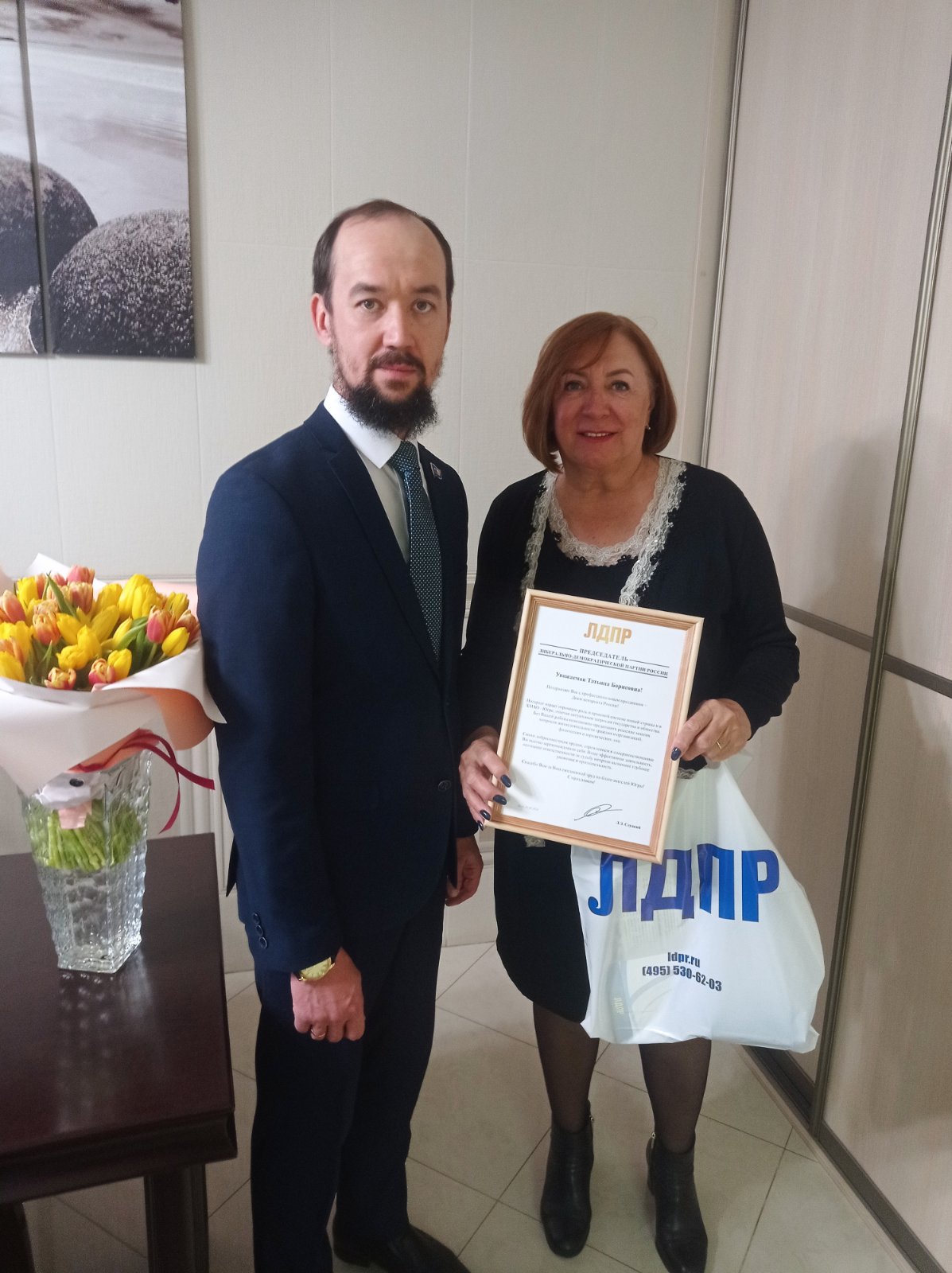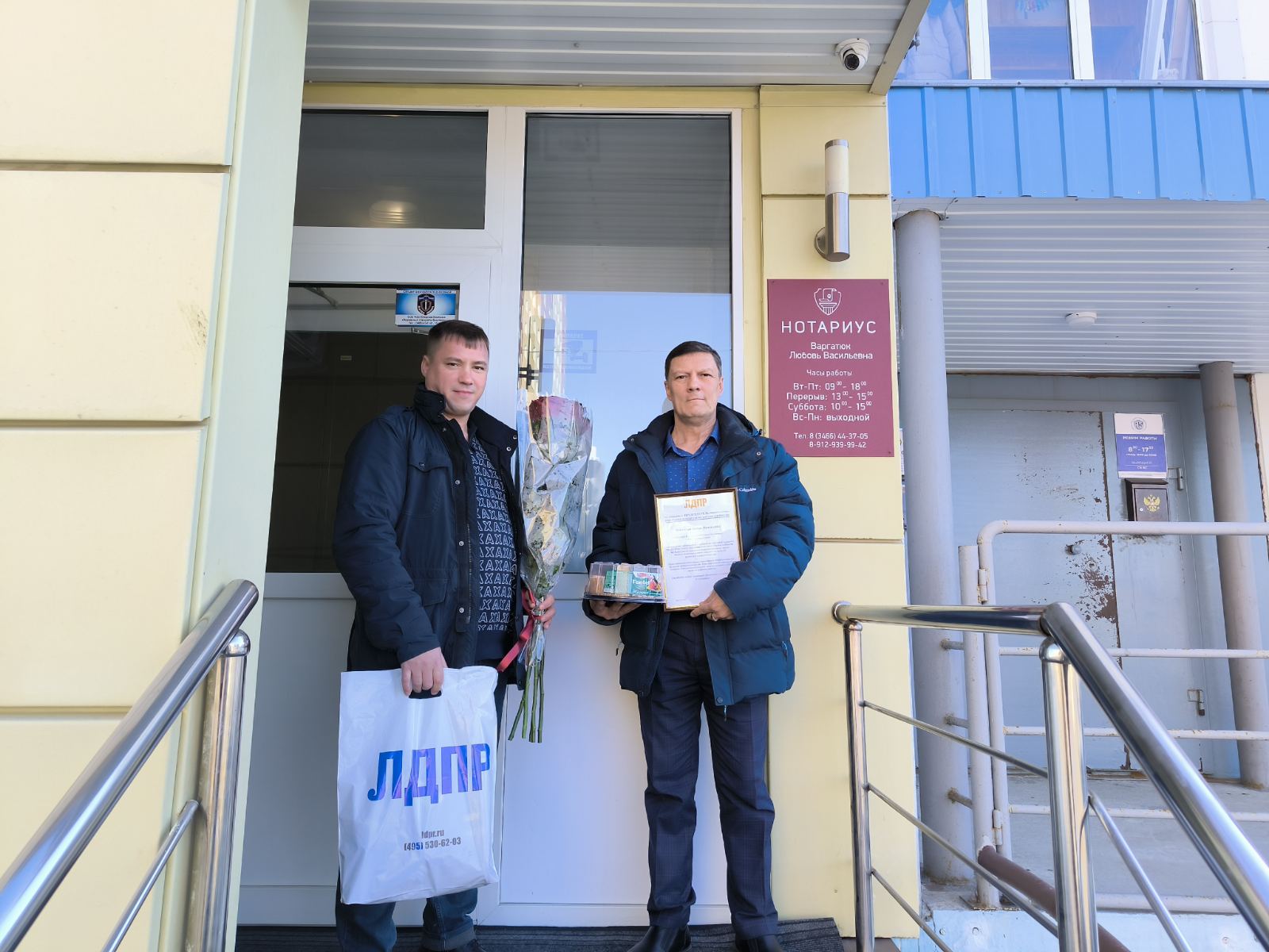 В этот же день координаторы первичных отделений в Нефтеюганске Андрей Щегалькин Андрей и Ленар Рафиков также поздравили нотариуса с профессиональным праздником, вручили благодарственное письмо и передали ей поздравления от председателя партии ЛДПР.