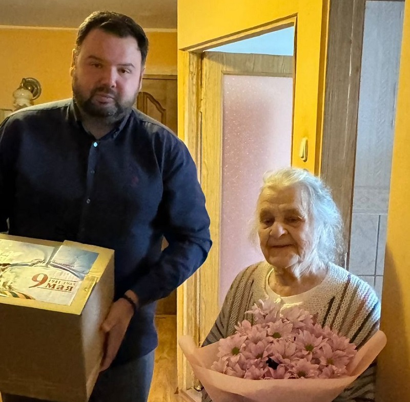 Партиец вручил заслуженной жительнице Гурьевска продуктовые наборы и цветы и поблагодарил за мужество и вклад в Победу.