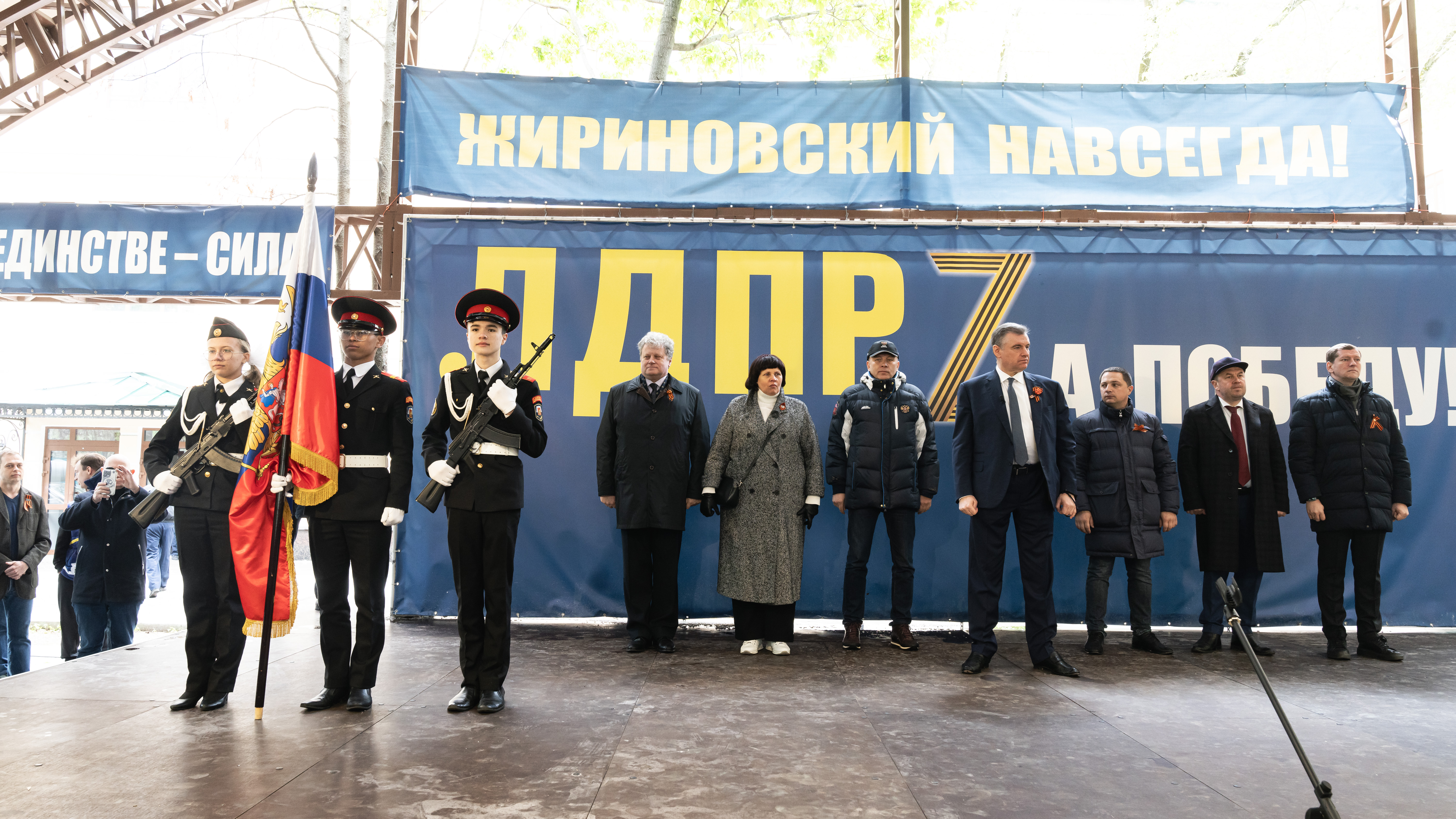 Праздник в честь 79-й годовщины Великой Победы Леонид Слуцкий, депутаты фракции ЛДПР в Государственной Думе, сенаторы, активисты и сторонники либерал-демократов продолжили на партийном митинге-концерте.