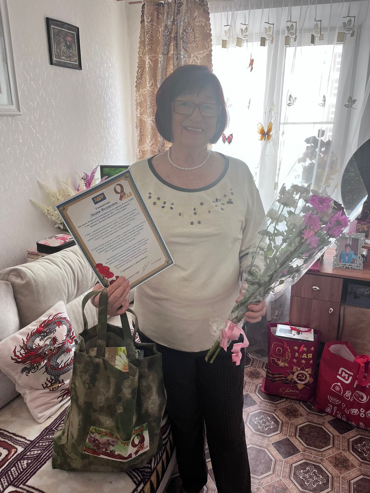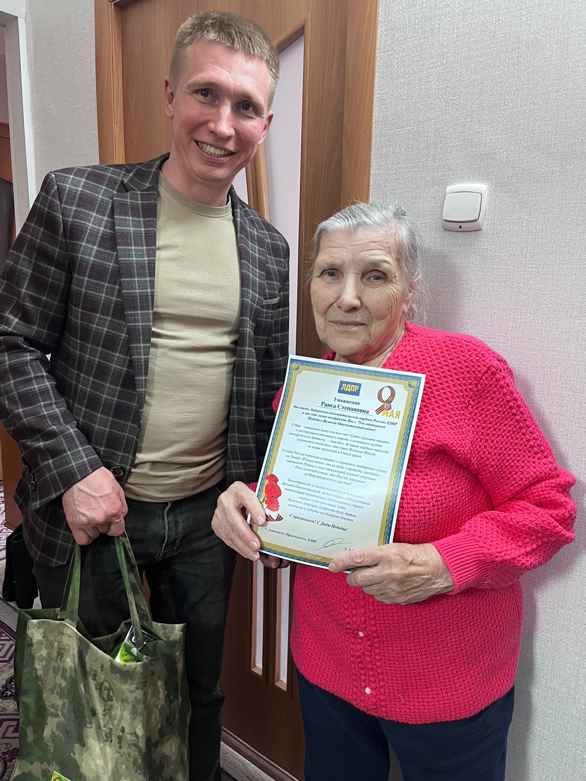 По сложившейся традиции, наши активисты в Нягани тоже приходят в гости с поздравлениями и передают памятные подарки, продуктовые наборы, цветы и открытки с добрыми пожеланиями в адрес свидетелей тех страшных дней - военных событий 1941-1945 годов. В этот раз поздравительный адрес передали от Председателя ЛДПР Леонида Слуцкого двум жительницам, которых не было в городе 9 мая.