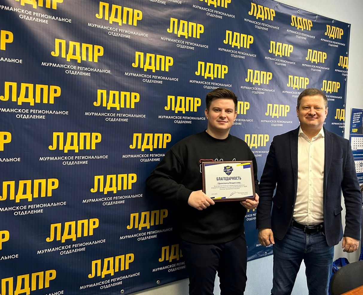 Представители Мурманского регионального отделения ЛДПР, Владислав Ефимович и Валерий Лебедев, были отмечены Благодарностями от Лидера ЛДПР Леонида Слуцкого