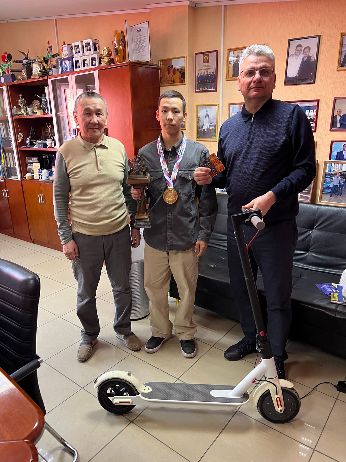 За достижения в спортивных состязаниях народный депутат вручил 19-летнему спортсмену электросамокат и сертификаты от автодома “Кармен”. Также депутат поблагодарил его тренера Илью Иванова за умение мотивировать спортсменов.