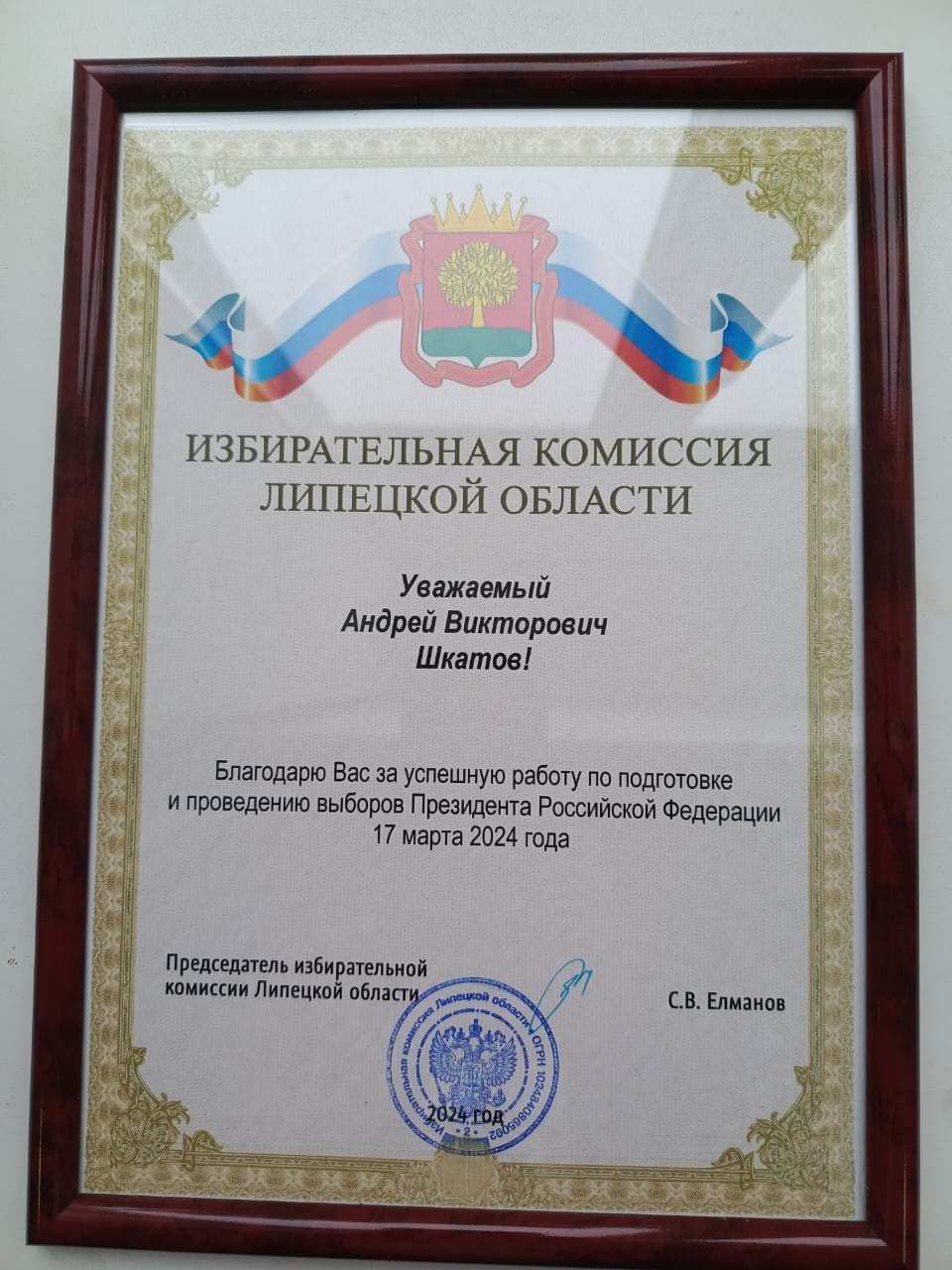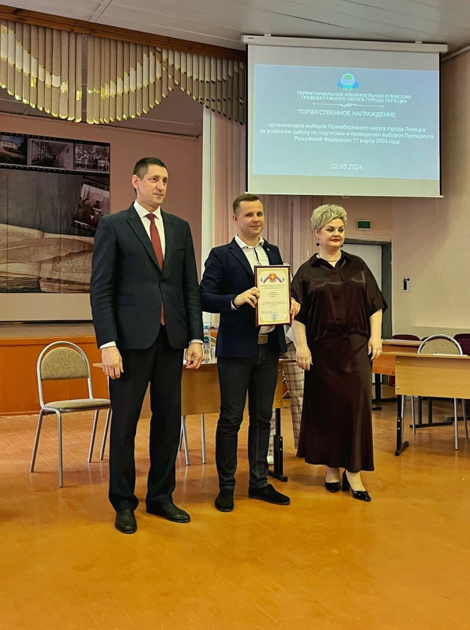 Член избирательной комиссии Правобережного округа города Липецка от ЛДПР Андрей Шкатов получил благодарственное письмо за организацию выборов Президента России в марте 2024 года. Награду ему вручил председатель Липецкого областного избиркома Сергей Елманов.