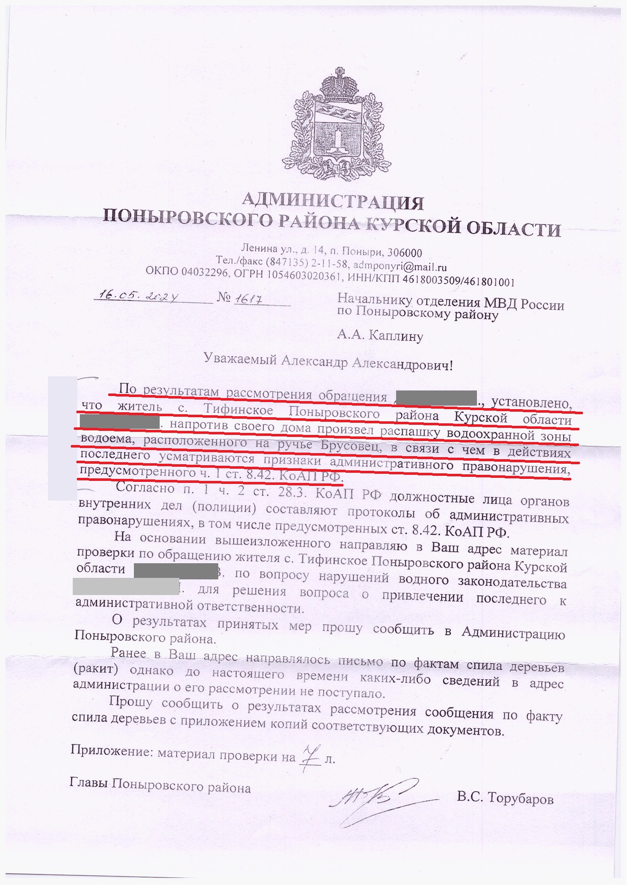 В общественную приемную ЛДПР обратился житель одного из населенных пунктов Поныровского района. Заявитель сообщил, что один из его соседей произвел напротив своего дома распашку водоохранной зоны водоема