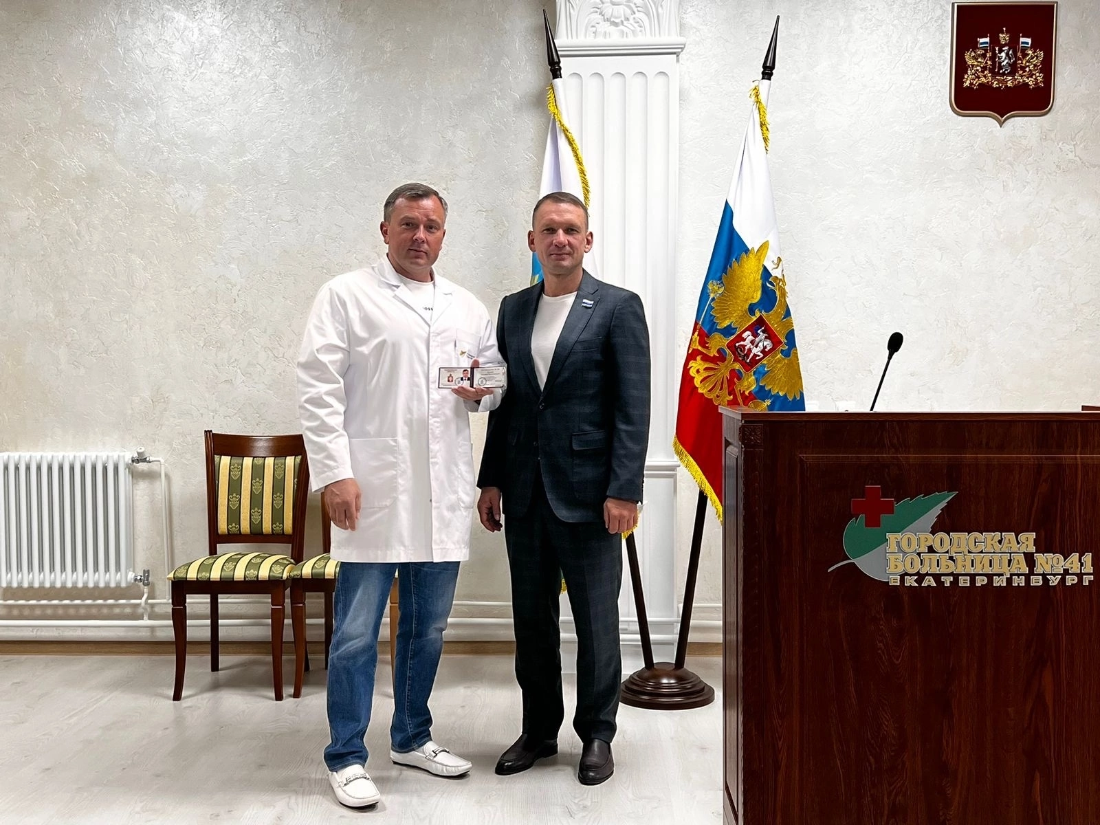 Сегодня координатор Свердловского регионального отделения ЛДПР, депутат Законодательного Собрания Свердловской области Александр Каптюг поздравил с Днём медицинского работника сотрудников «Городской больницы № 41», в том числе заместителя генерального директора, врача-нейрохирурга Евгения Климова. А также вручил удостоверение помощника депутата новому члену партии