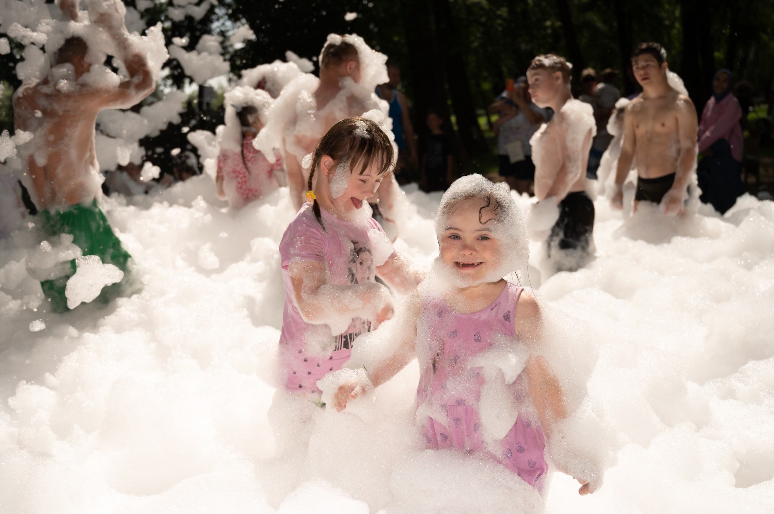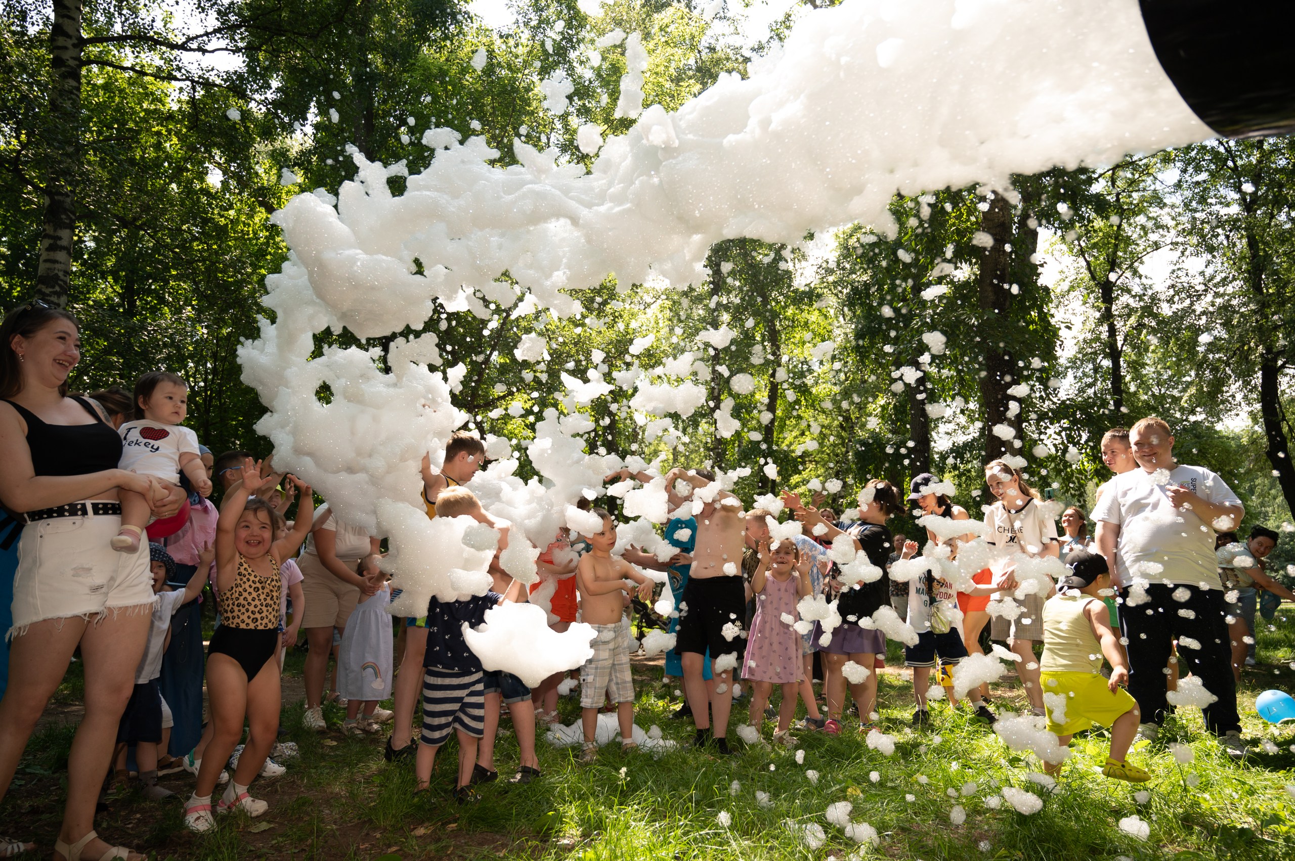 Для особенных ребят были организованы танцы, полезные игры с педагогами ГБУ «ЦССУ г.Казани», праздничный стол с морсами, мороженным и прочими сладостями. После настал долгожданный момент, когда малышей накрыло огромное пенное облако.