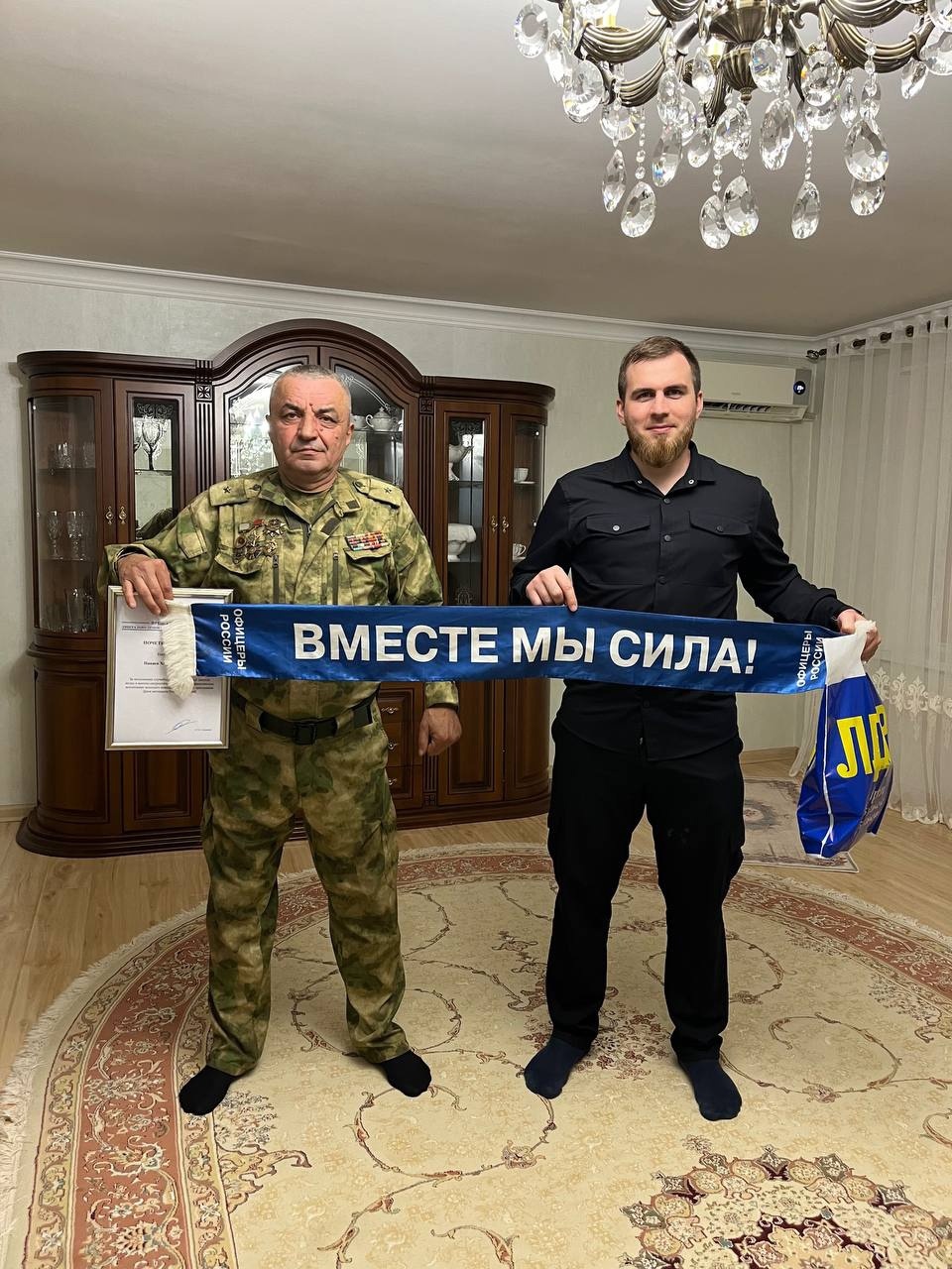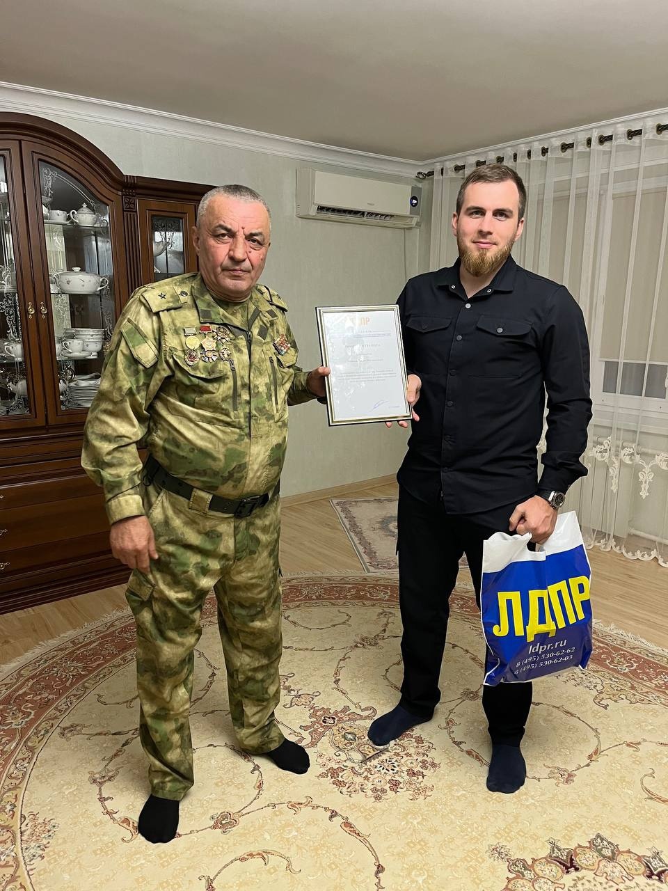 Зам. координатора Регионального отделения ЛДПР Умаров У.А. вручил ветерану боевых действий Почетную грамоту партии за заслуги перед отечеством, подписанную лидером ЛДПР Леонидом Слуцким.