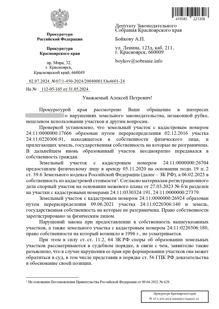 В приёмную депутата ЛДПР Алексея Бойкова поступила жалоба. В ней сообщалось о рубке лесных насаждений, незаконных действиях с пригородной землёй в Емельяновском районе. Парламентарий обратился за проверкой поступившей информации в надзорные органы, и доводы заявителя нашли подтверждение