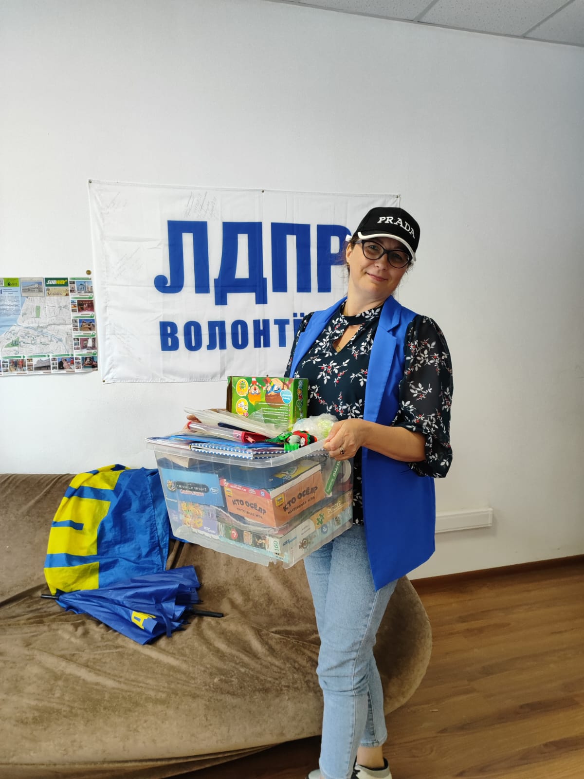 Татьяна Алексеева от лица партии передала коробку с канцелярскими наборами, детскими книгами, так называемыми развивашками, одежду. Собранный груз отправится напрямую у многодетную семью!