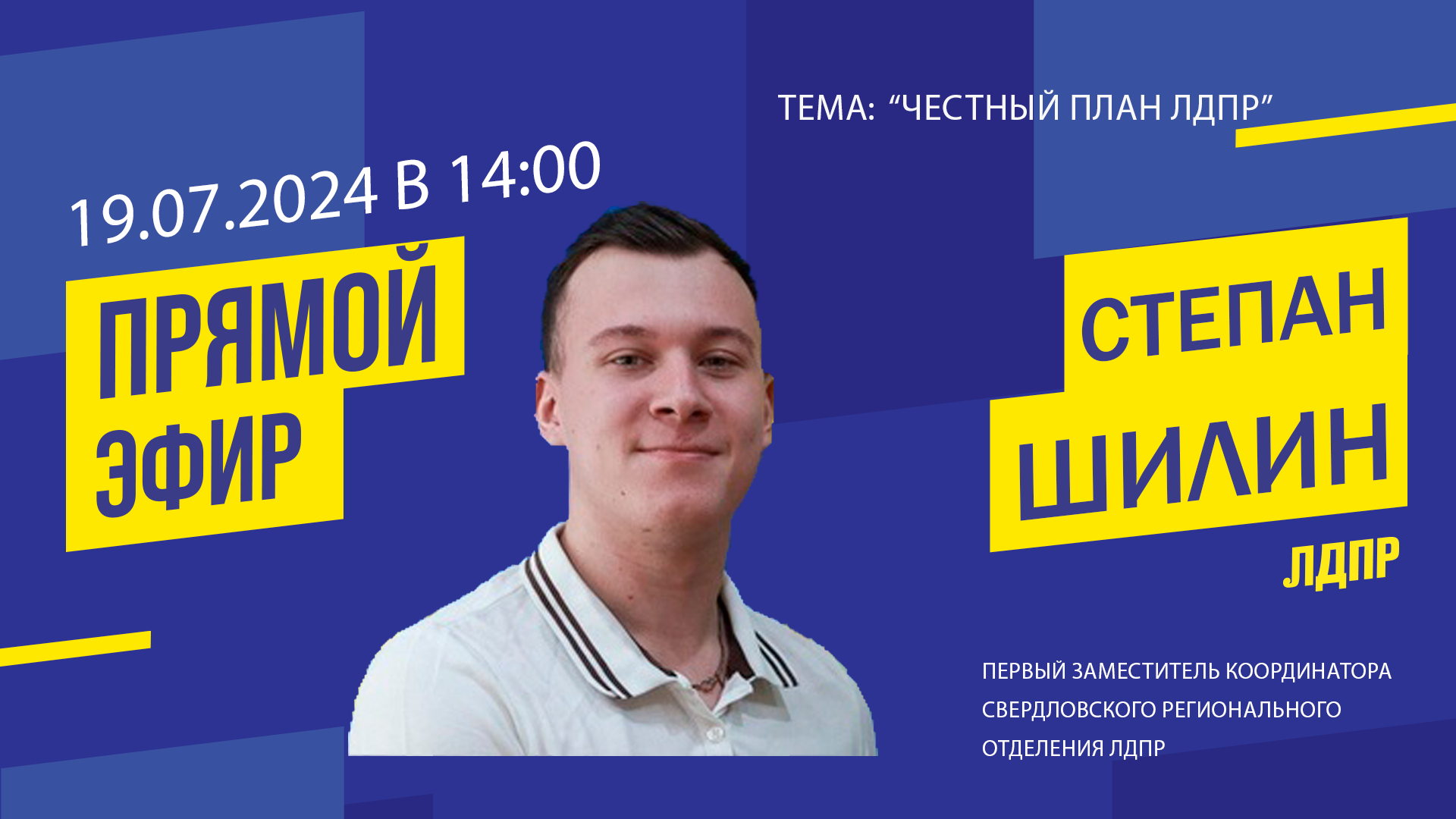 19 июля в штабе Свердловского регионального отделения ЛДПР на онлайн-площадке VK состоится прямой эфир на тему: «Честный план ЛДПР». Проведет эфир и ответит на ваши вопросы первый заместитель координатора Свердловского регионального отделения ЛДПР Степан Шилин