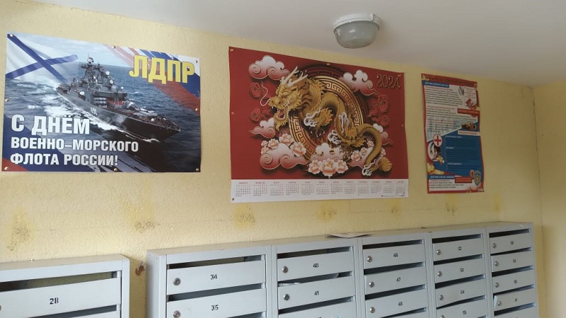 Координатор ЛДПР Ленинградского района областного центра Сергей Плужник вместе со своими помощниками украсил плакатами не только офис городского отделения партии, но и подъезды домов.